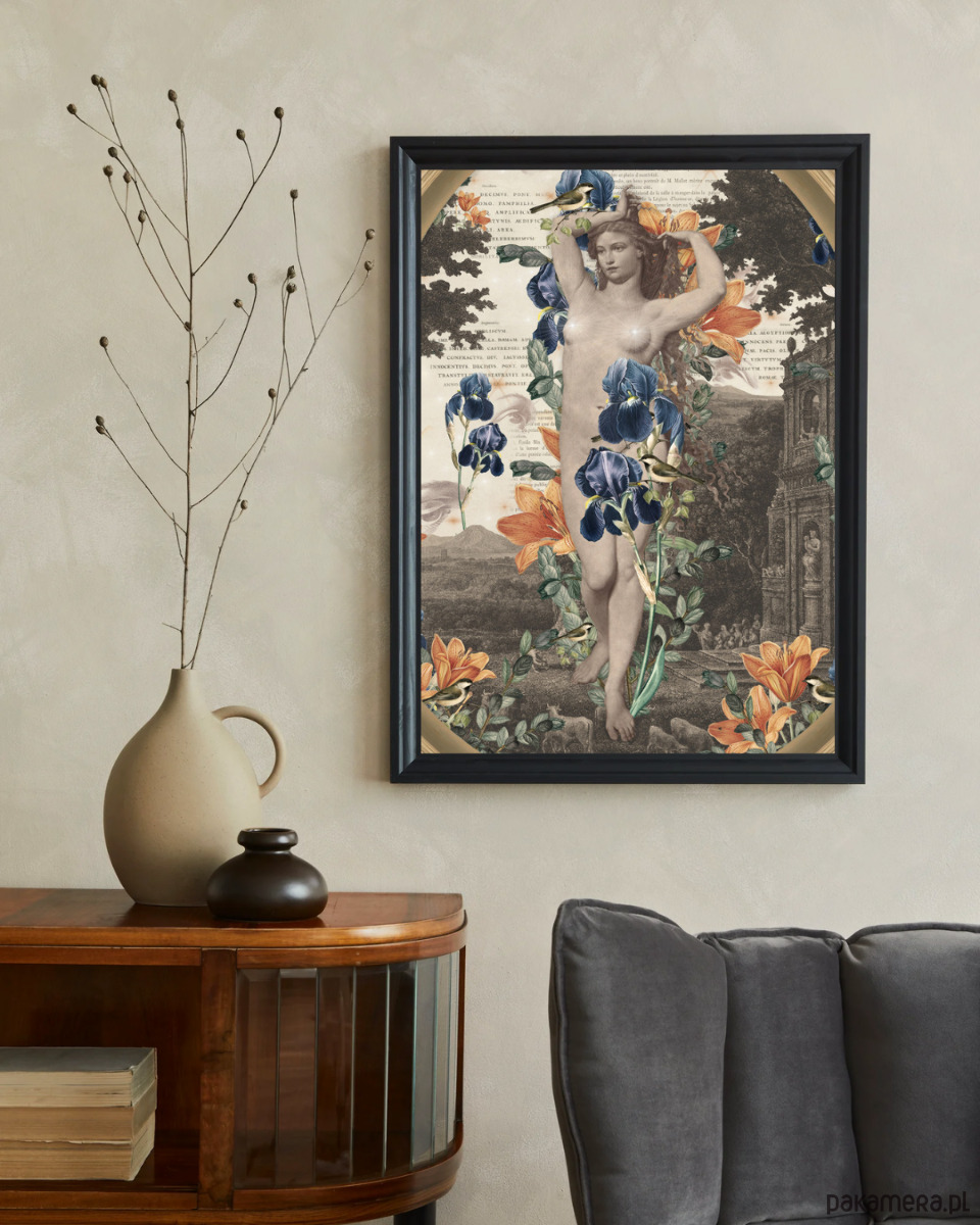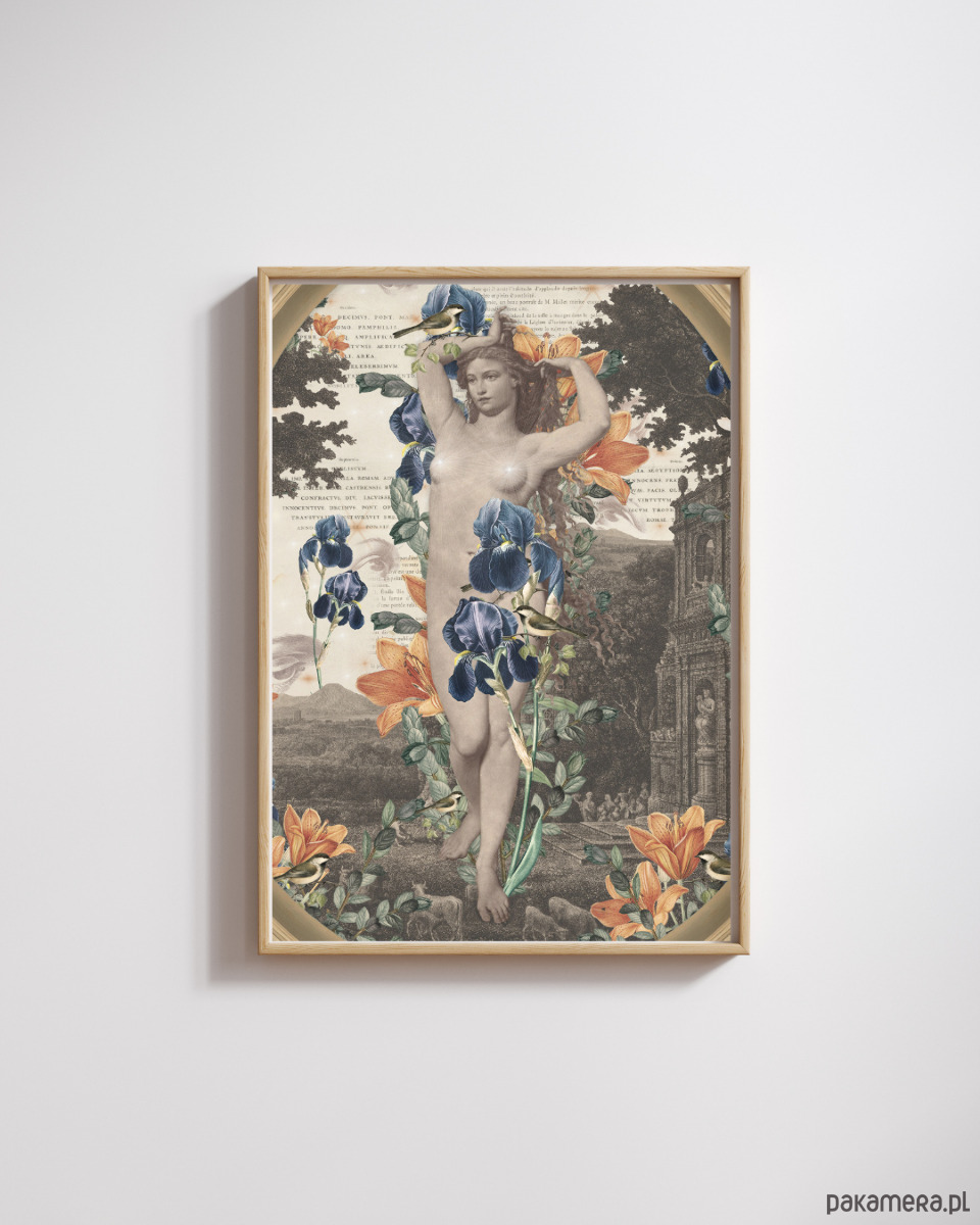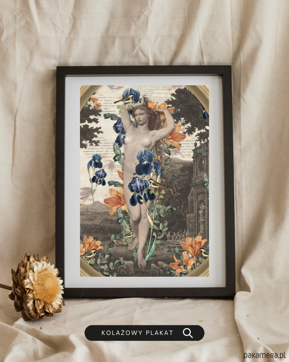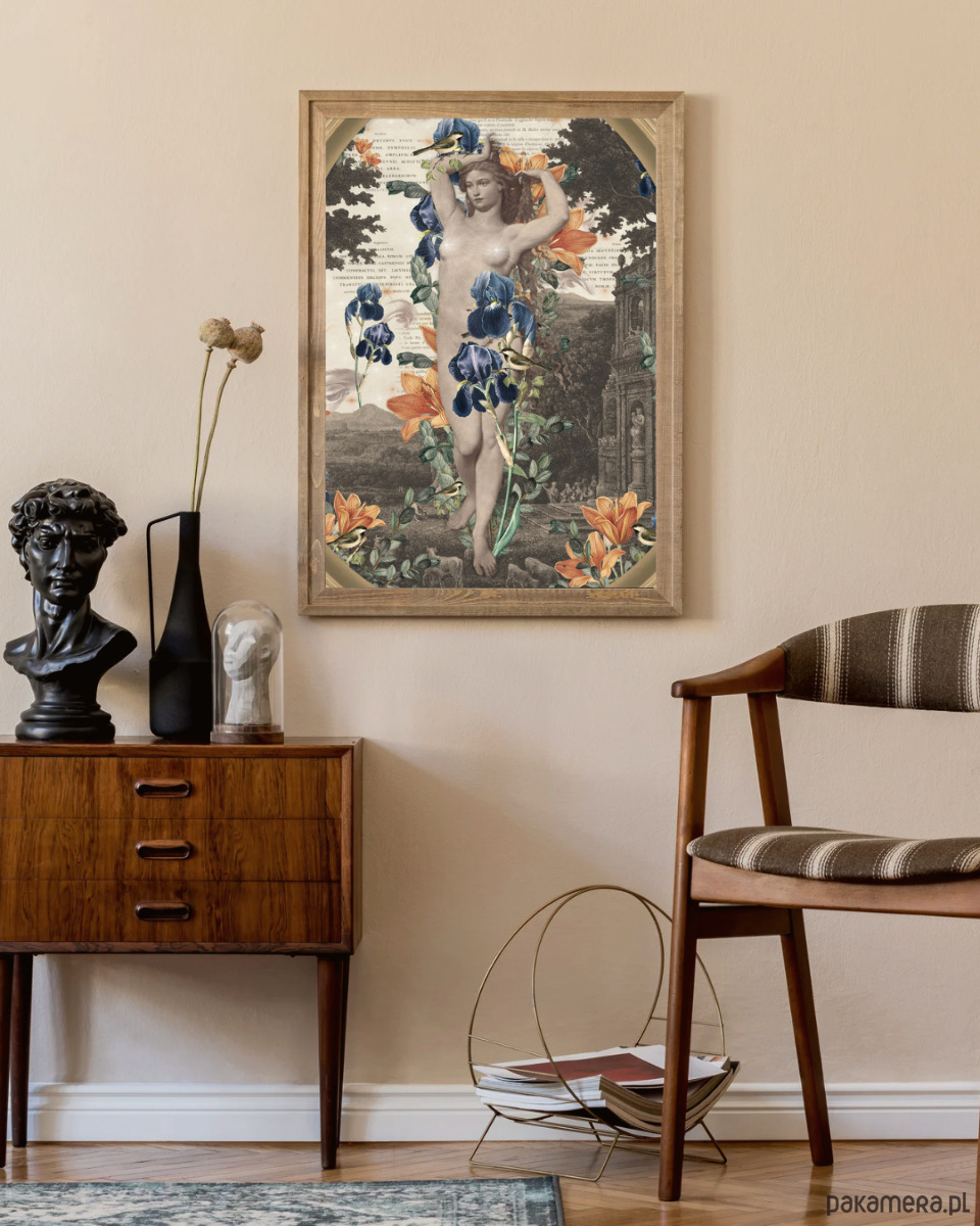 „Wolność” to wyjątkowy plakat stworzony metodą kolażu cyfrowego w programie Photoshop, inspirowany klasycznym pięknem, naturą i symboliką.