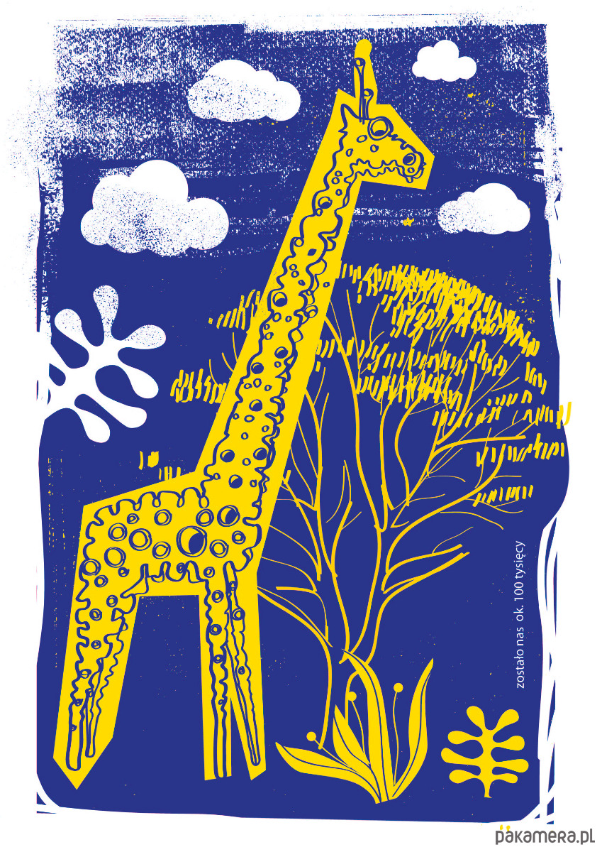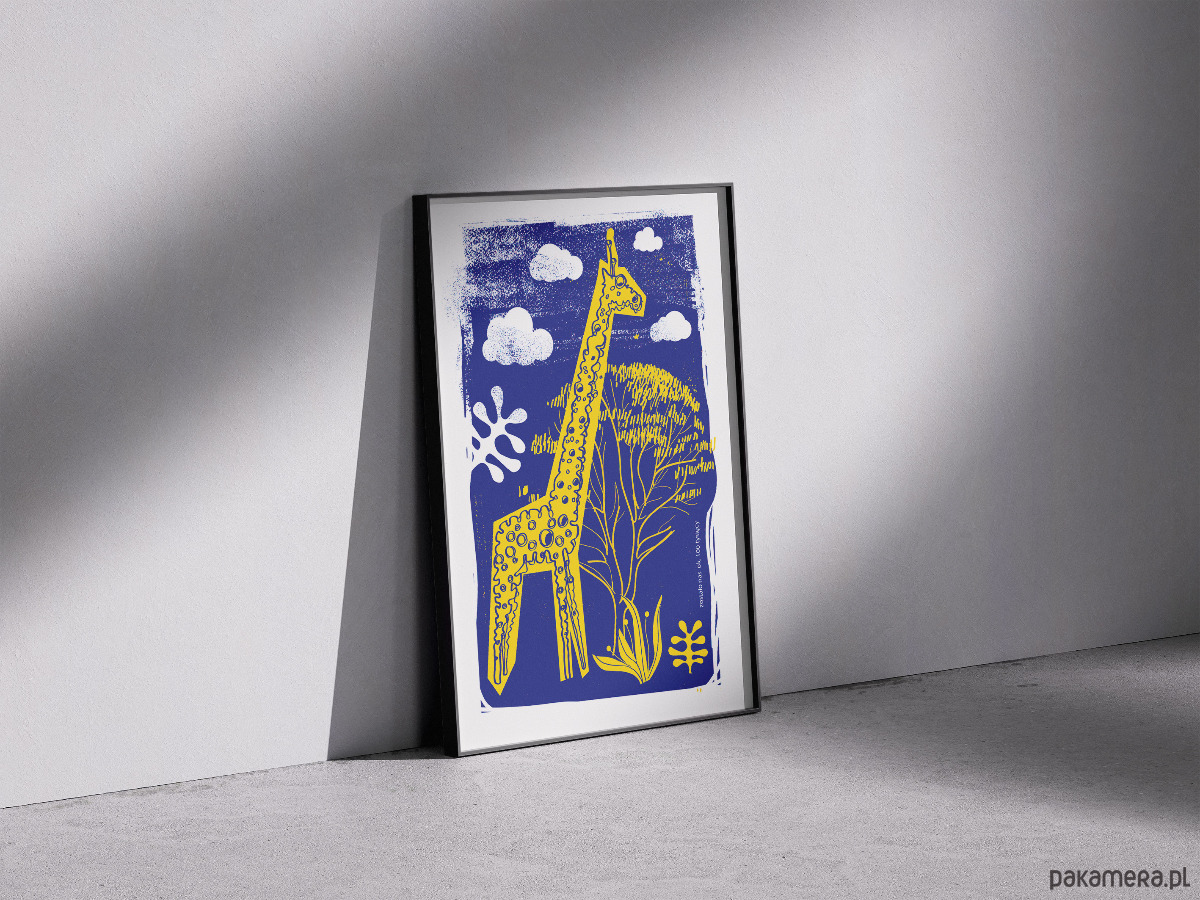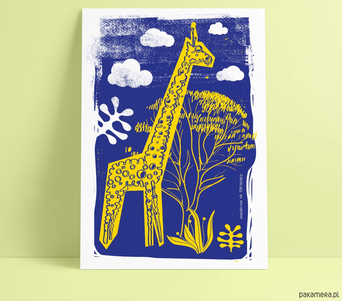 Plakat "Wolska żyrafa" to grafika przedstawiająca rzeźbę z warszawskiej woli, która powstała w 1968 roku na Biennale Rzeźby w Metalu w Warszawie. Autorem rzeźby jest Władysław Frycz. Obecnie znajduje się na skwerze u zbiegu ulic Kasprzaka i Wolskiej. Plakat "Wolska żyrafa" jest częścią cyklu "Zwierzyniec Warszawski II", który przedstawia słynne zwierzęta Warszawy. Żyraf zostało na świecie ok. 100 tyś. szt. i ta informacja jest również umieszczona na plakacie. Powstał na cześć tych majestatycznych zwierząt. Plakat dostępny w różnych wymiarach, drukowany w limitowanej serii 50 szt. Praca pasować będzie do wnętrz nowoczesnych i minimalistycznych ale także ekstrawaganckich. Może szczególnie spodobać się podróżnikom i miłośnikom przyrody. Będzie pasować do sypialni i salonu, a także przedpokoju.