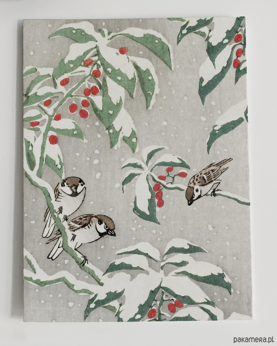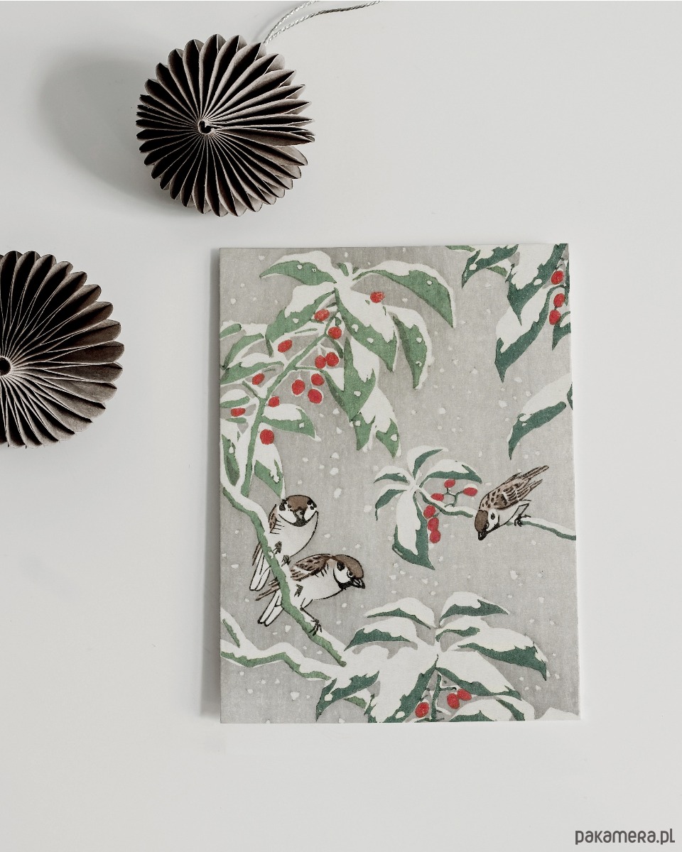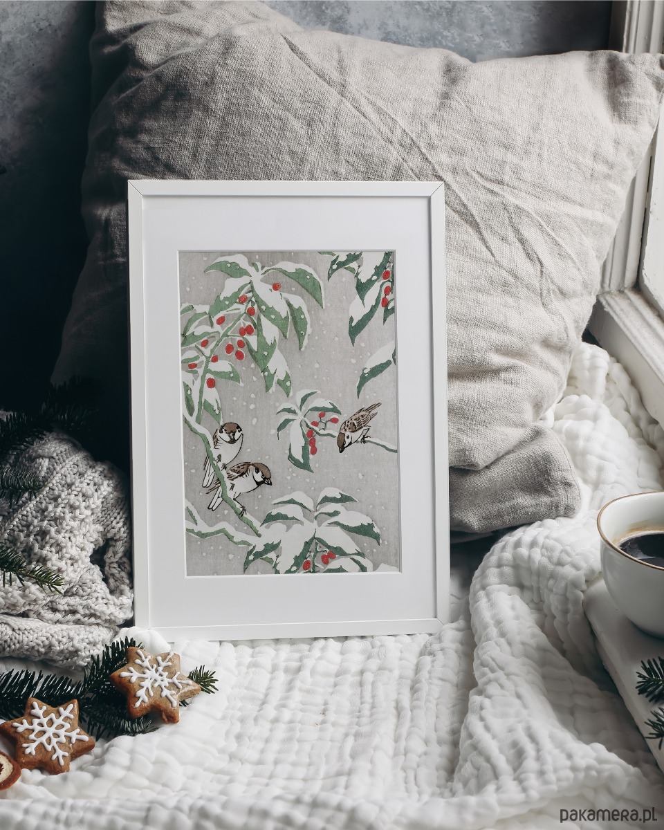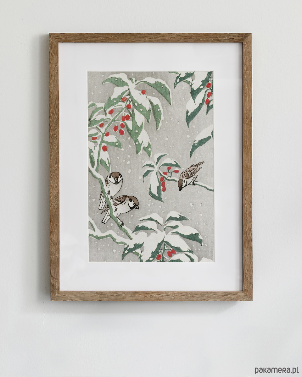 Plakat przedstawiający wróble w zimowej scenerii wśród krzewu z czerwonymi owocami. W tle padający śnieg.