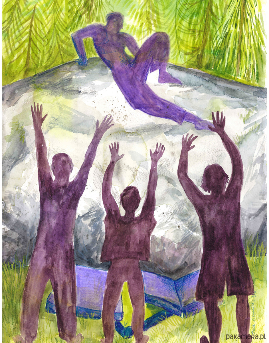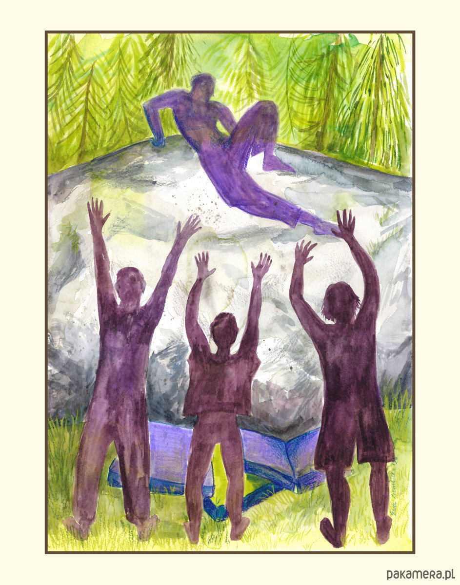 Wspinanie to ludzie, to wsparcie i motywacja. Ta ilustracja pokazuje odważny ruch i społeczność, która wspiera i asekuruje. Plakat dla wspinaczy skałkowych, bouldering.