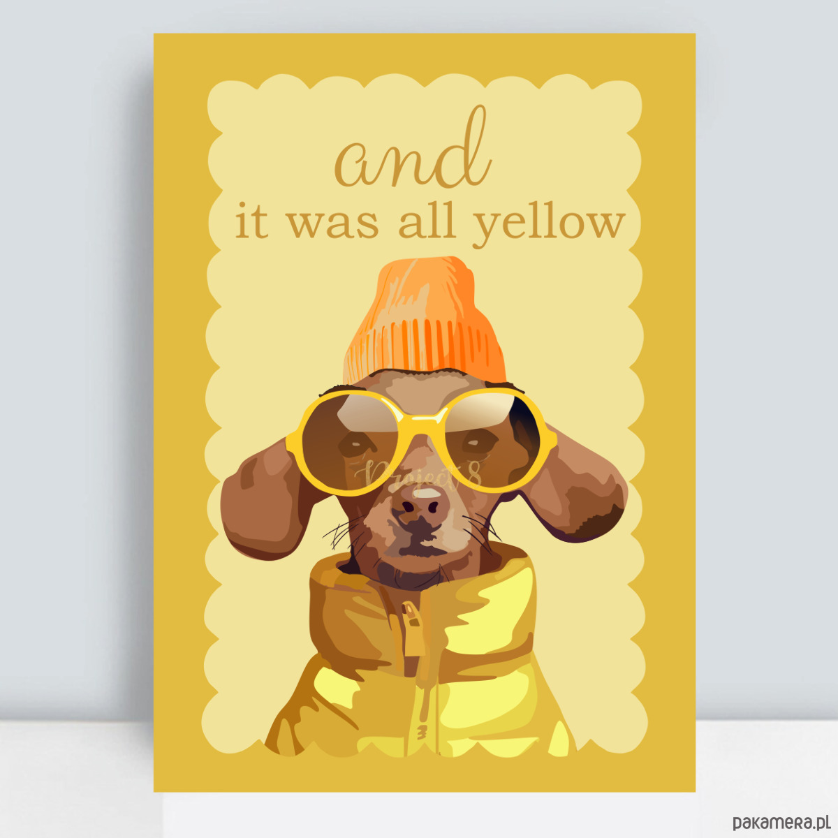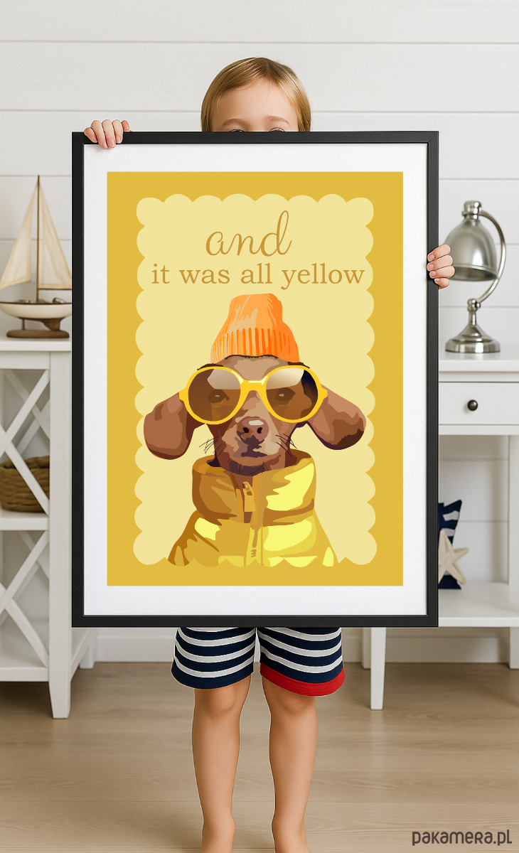 Wszystko jest żółte, jamnik w żółtym na żółtym. Zabawny plakat do pokoju dziecka w kolorze żółtym.