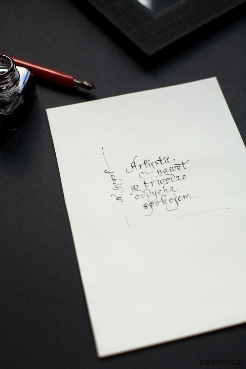 Elegancki plakat z cytatem, wykaligrafowany ręcznie czarnym atramentem na papierze ekologicznym w kolorze kości słoniowej: