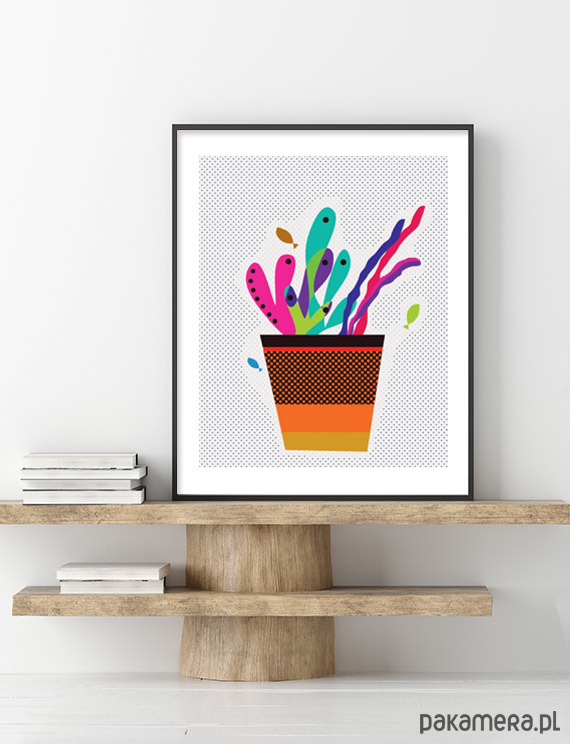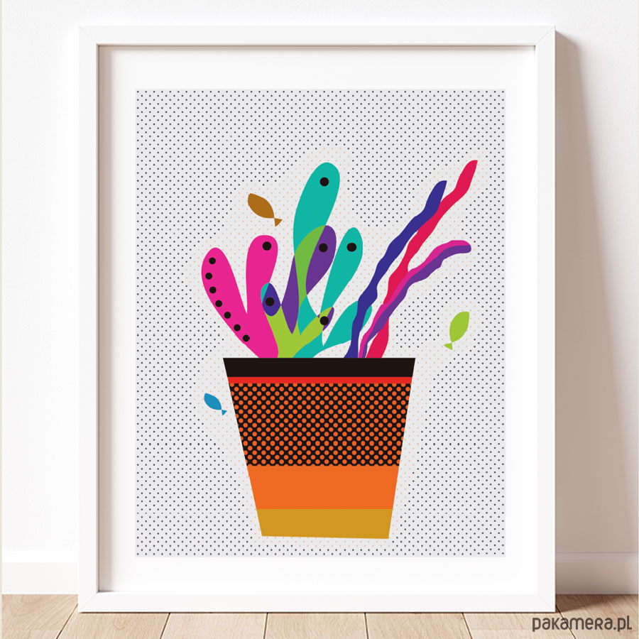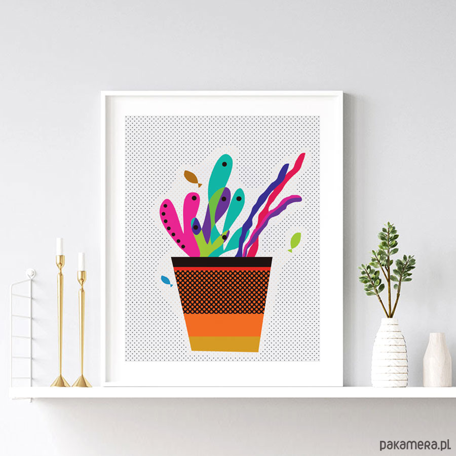 Plakat z doniczką, kolorowe liście