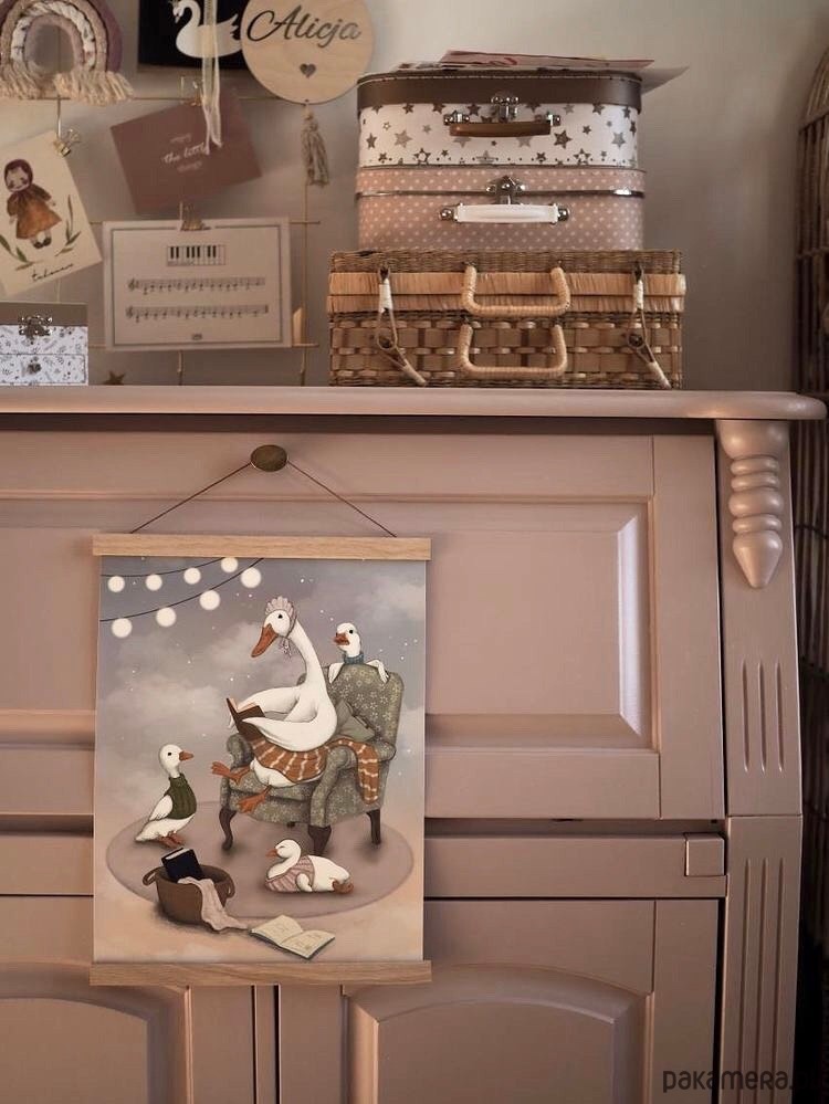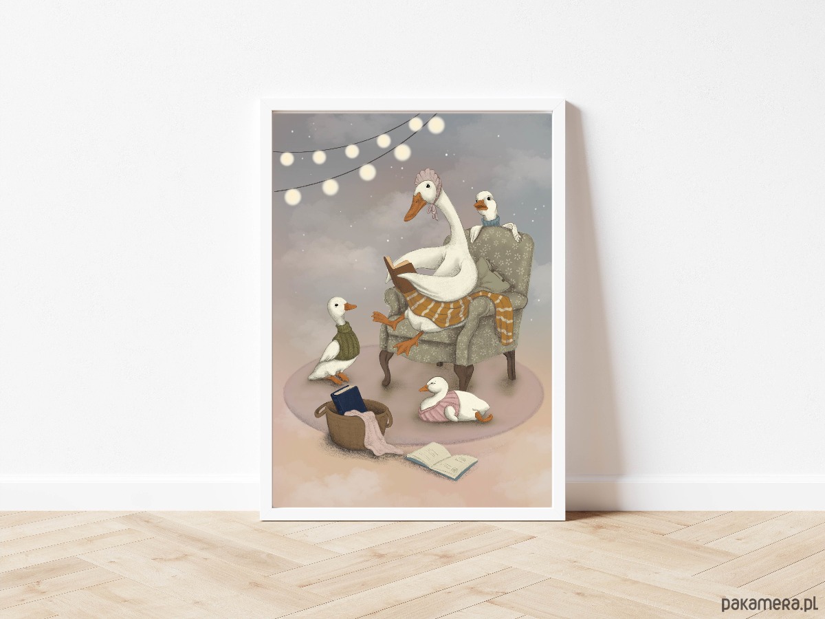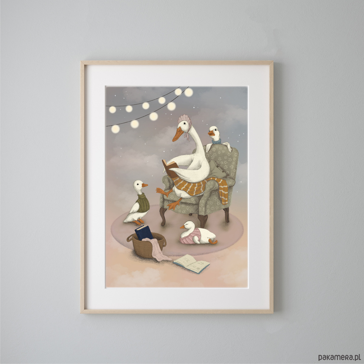 Ciepły plakat do pokoju dziecka. Mama GĄSKA razem ze swoimi dziećmi spędza czas czytając maluszkom ich ulubioną książkę. Miękki fotel, ciepły kocyk i dzieci...