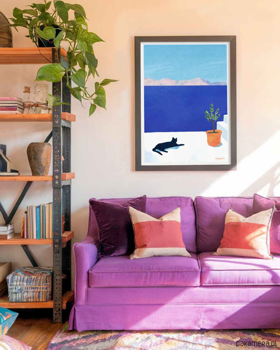 Chabrowa barwa wody, białe patio i czarny kot drzemiący w promieniach słońca. Wakacyjna grafika sprawi, że pogrążymy się w marzeniach o odprężającej podróży, a dodatkowo pięknie ozdobi każde wnętrze.