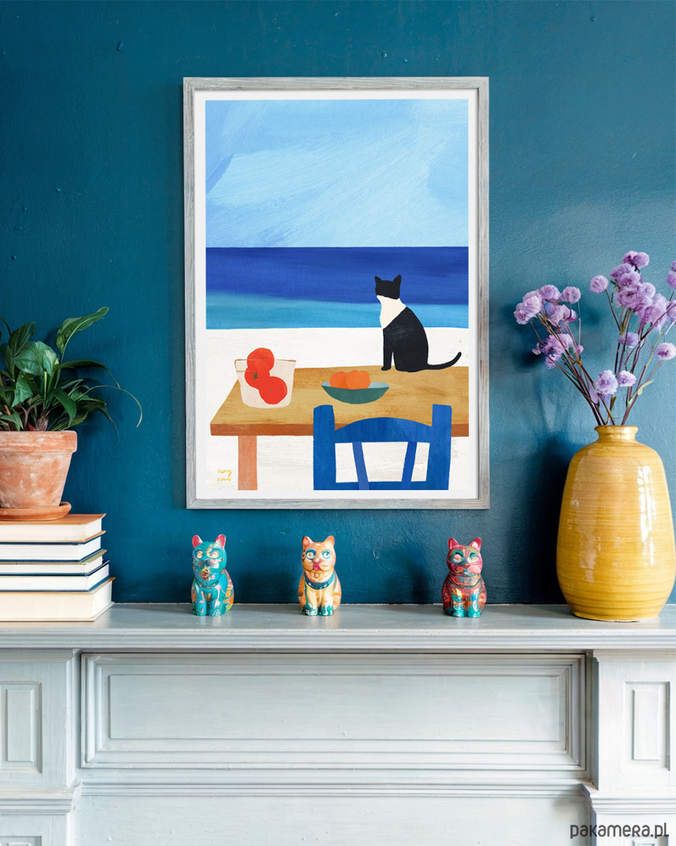 Pełen lata plakat z kotem - "Wakacyjny lunch" zachęca do porzucenia nieustannego biegu i rozkoszowania się chwilą. Słoneczna biel i odcienie niebieskiego ożywione są akcentami owocowych czerwieni i pomarańczy. Kot z biało-czarnym umaszczeniem wpatruje się w horyzont. Grafika doskonale sprawdzi się zarówno w salonie, jak i jadalni, w której morskie kolory dodadzą relaksującego akcentu.