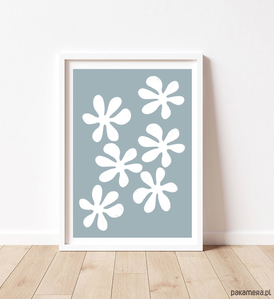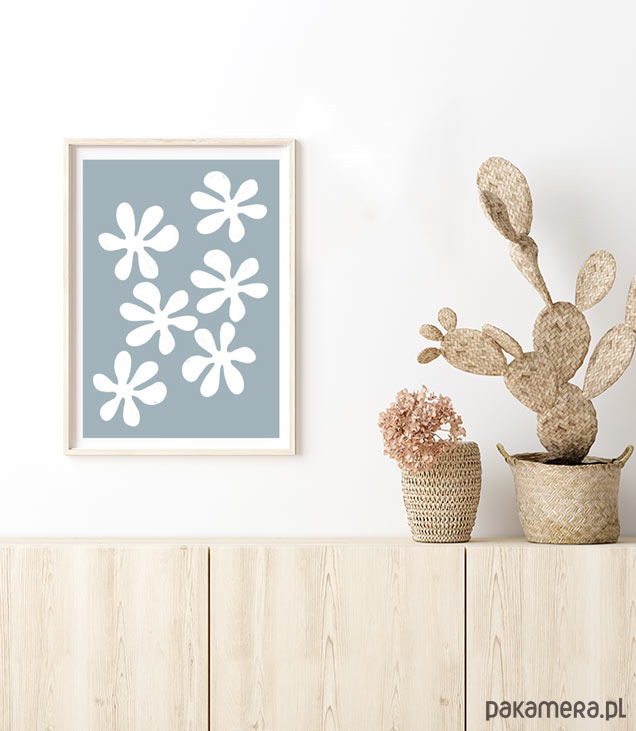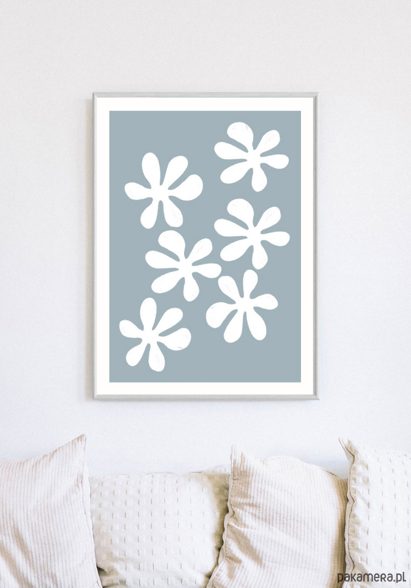 Ten abstrakcyjny plakat w kolorze szaro-błękitnym, z białymi motywami przypominającymi kwiaty, wprowadzi do wnętrza spokój i świeżość. Pięknie prezentuje się w jasnych, minimalistycznych wnętrzach. Spokojna, harmonijna kompozycja, autorski projekt.