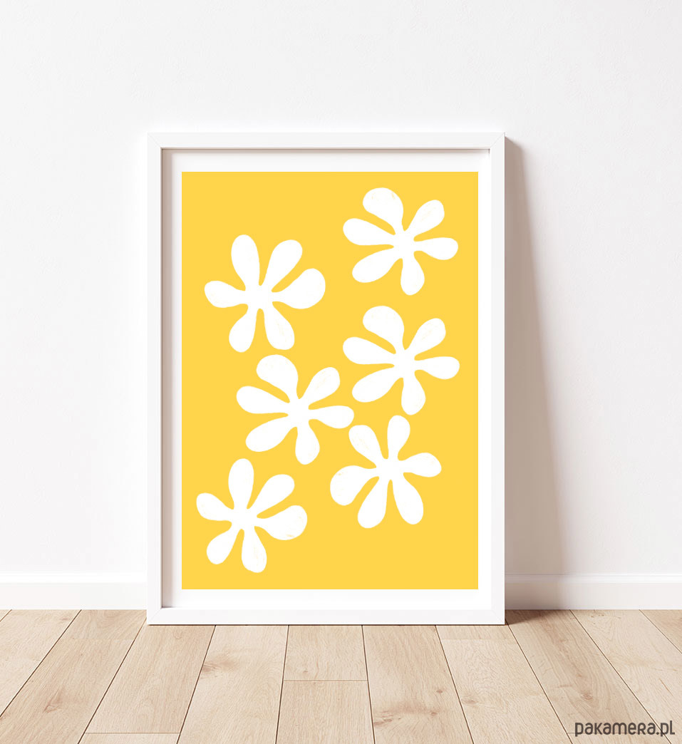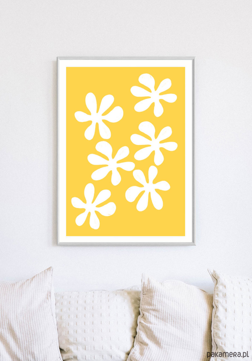 Słoneczny plakat z białymi motywami przypominającymi kwiaty, wprowadzi do wnętrza świeżość i dobrą energię. Pięknie prezentuje się w jasnych, minimalistycznych wnętrzach. Spokojna, harmonijna kompozycja, autorski projekt.