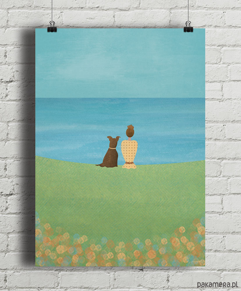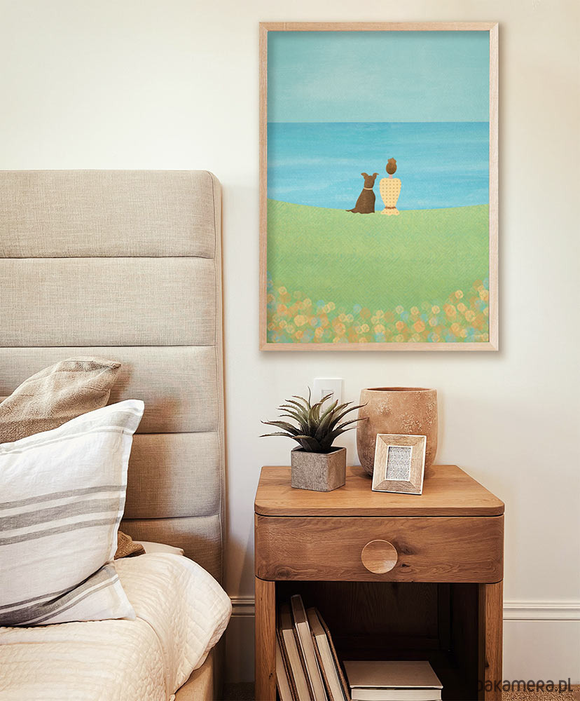 Plakat Z psem na łące ożywi każde wnętrze. Zielona trawa obsypana kolorowymi kwiatami, błękitne lustro wody w oddali i kontemplująca ten widok dziewczyna z psem. Jeśli da się odtworzyć ideę slow life w graficzny sposób, to dla nas byłby to właśnie taki leniwy, idealny dzień