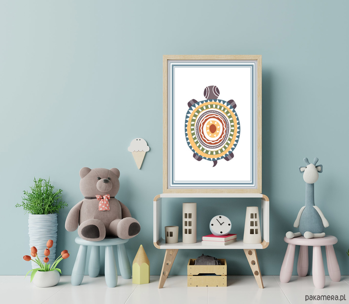 Kolorowy plakat z żółwikiem wprowadzi radosny nastrój do dziecięcego pokoju i nada mu przytulności. Autorski projekt, wysoka jakość wydruku. Plakat drukowany jest bez białego marginesu (passe partout).