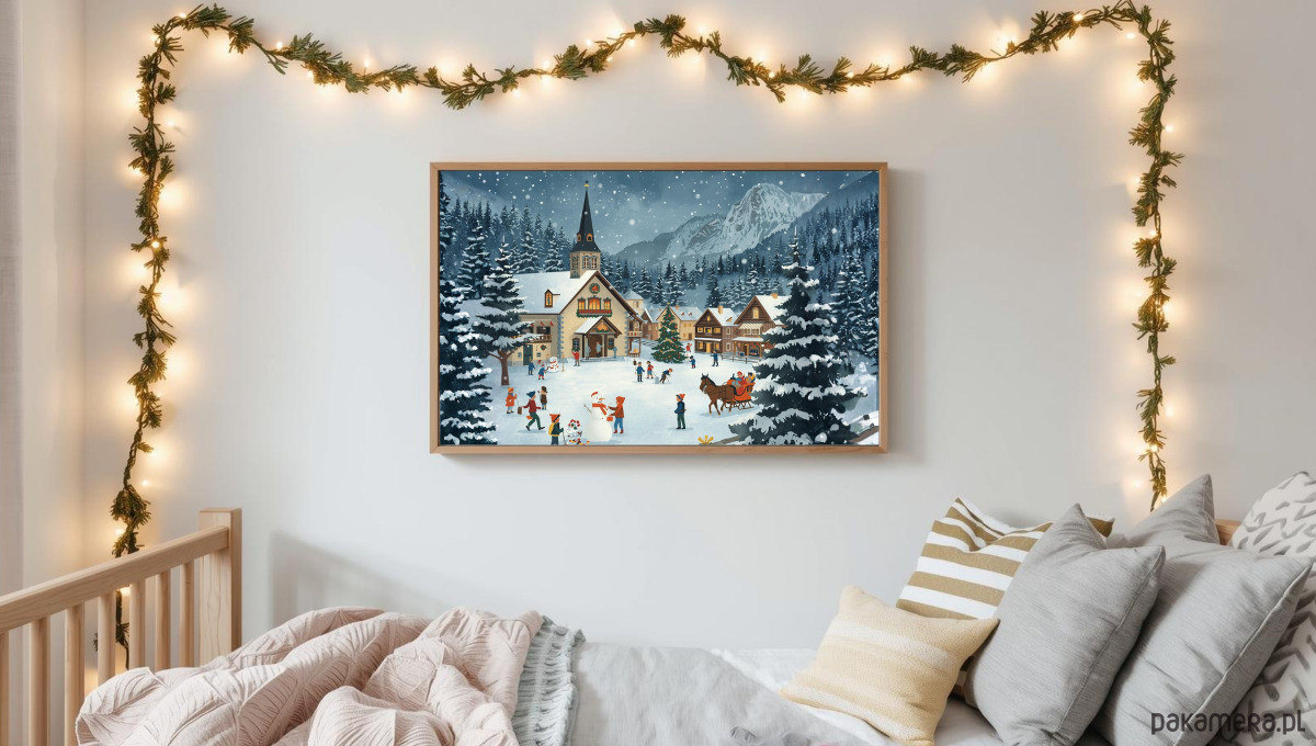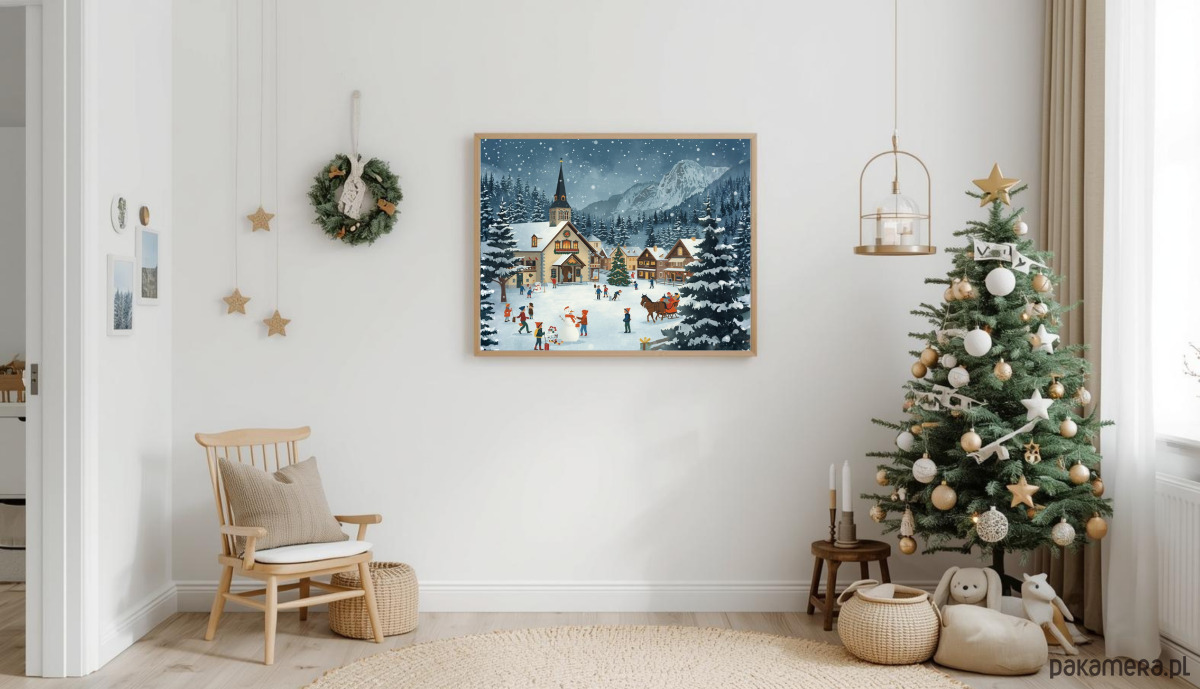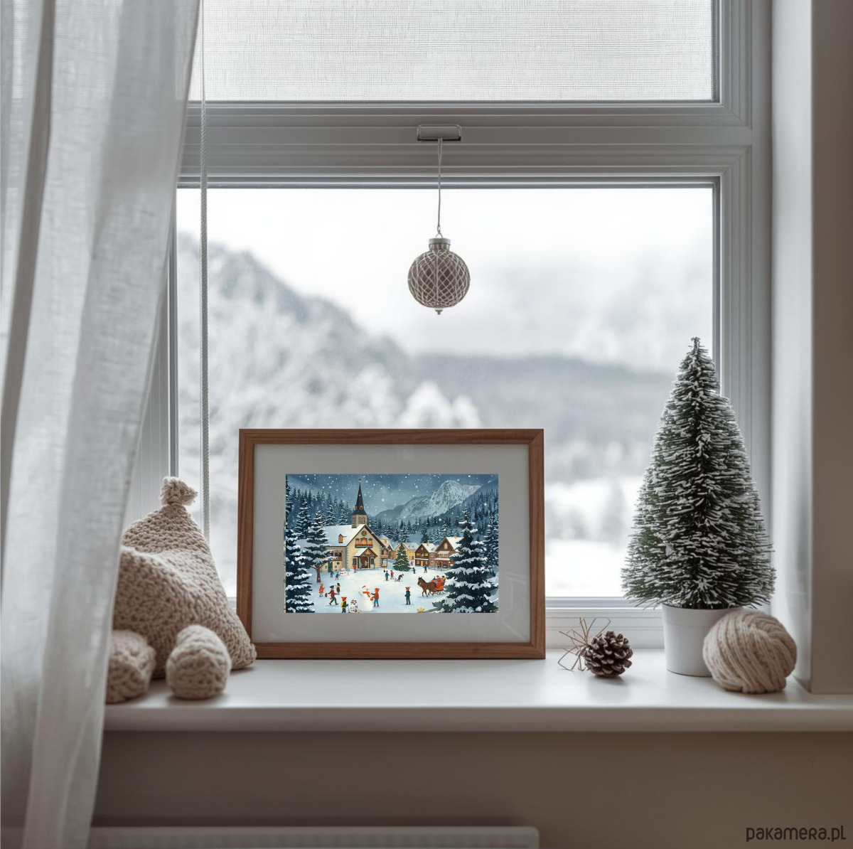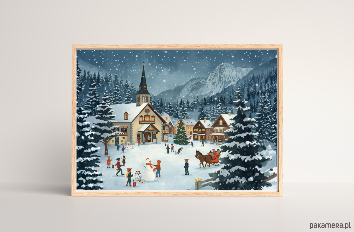 PLAKAT zimowa wioska ilustracja górski krajobraz zimowy