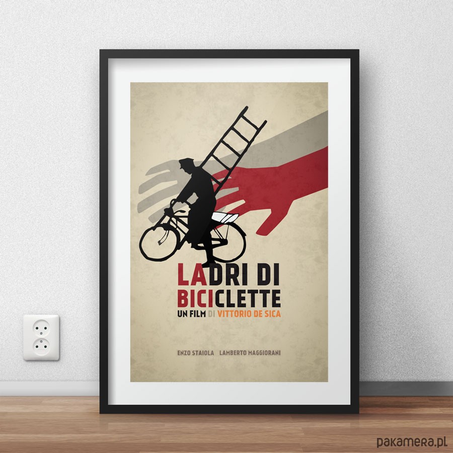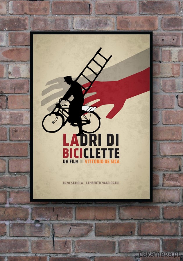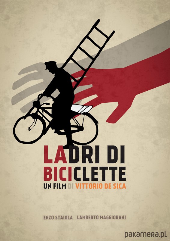 Plakat z autorską grafiką inspirowaną filmem Złodzieje Rowerów (Ladri di Biciclette), reż. Vittorio De Sica.
