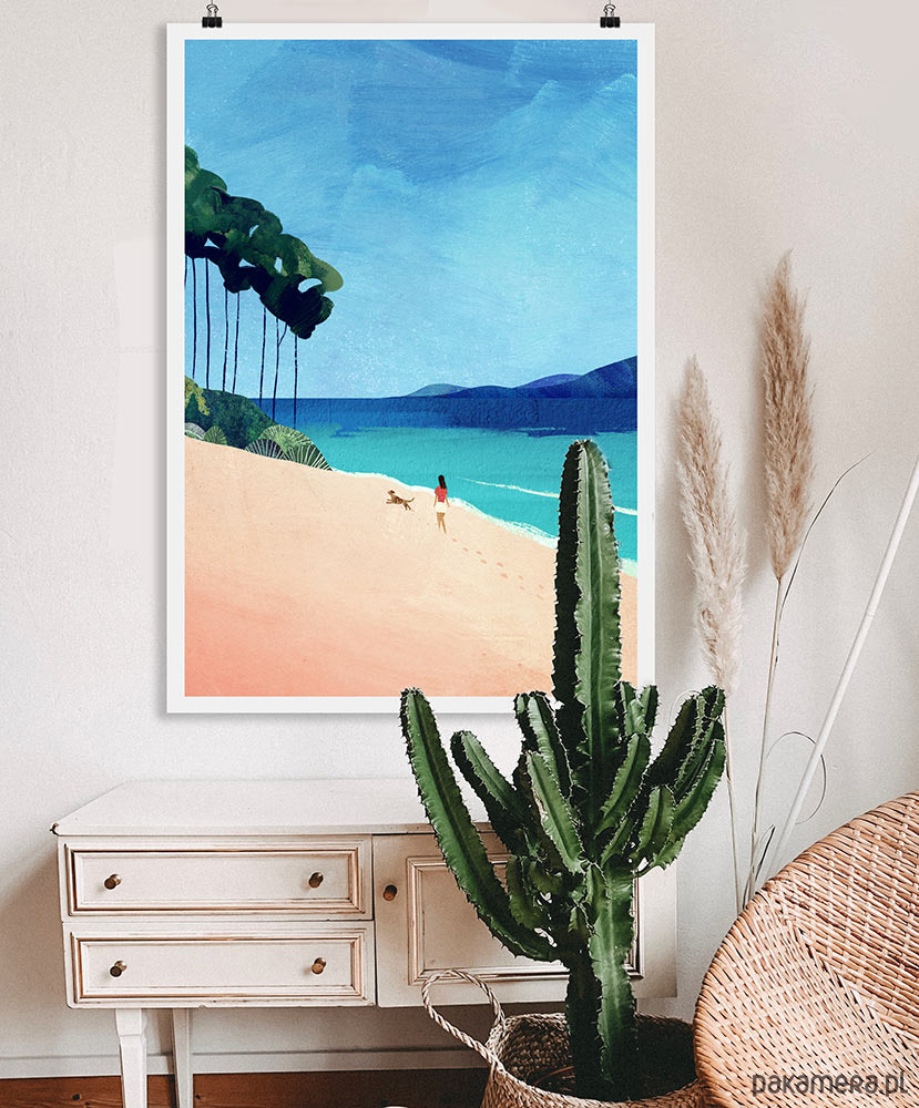 Plakat przenosi nas w sam środek słonecznego dnia. Brzegiem oceanu, po miękkim piasku spaceruje dziewczyna ze swoim psem. Lazurowe niebo odcina się ciepłą barwą od turkusu wody. Plakat "Złota plaża - spacer nad oceanem", to pochwała drobnych przyjemności, które stanowią najlepszy moment dnia.