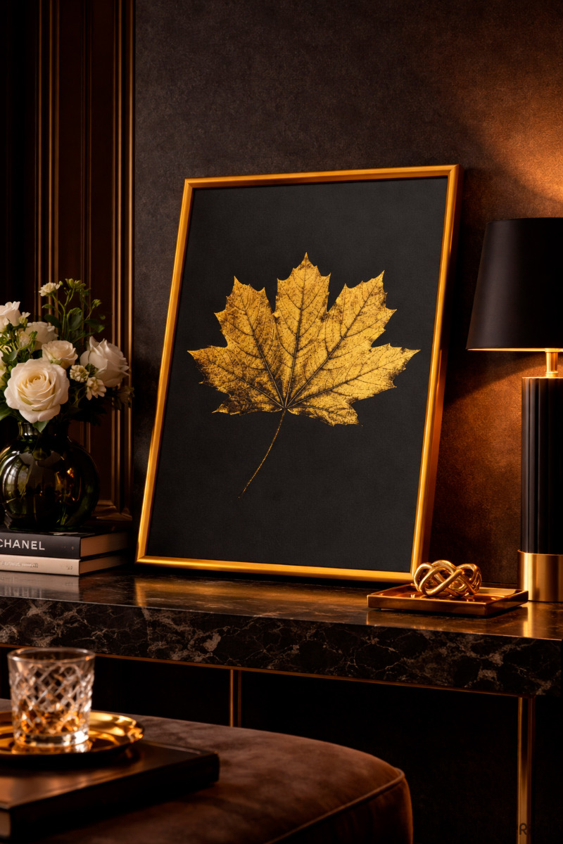 Plakat przedstawia artystyczną monotypię liścia klonu w złotej tonacji, co nadaje mu luksusowy i ponadczasowy charakter.