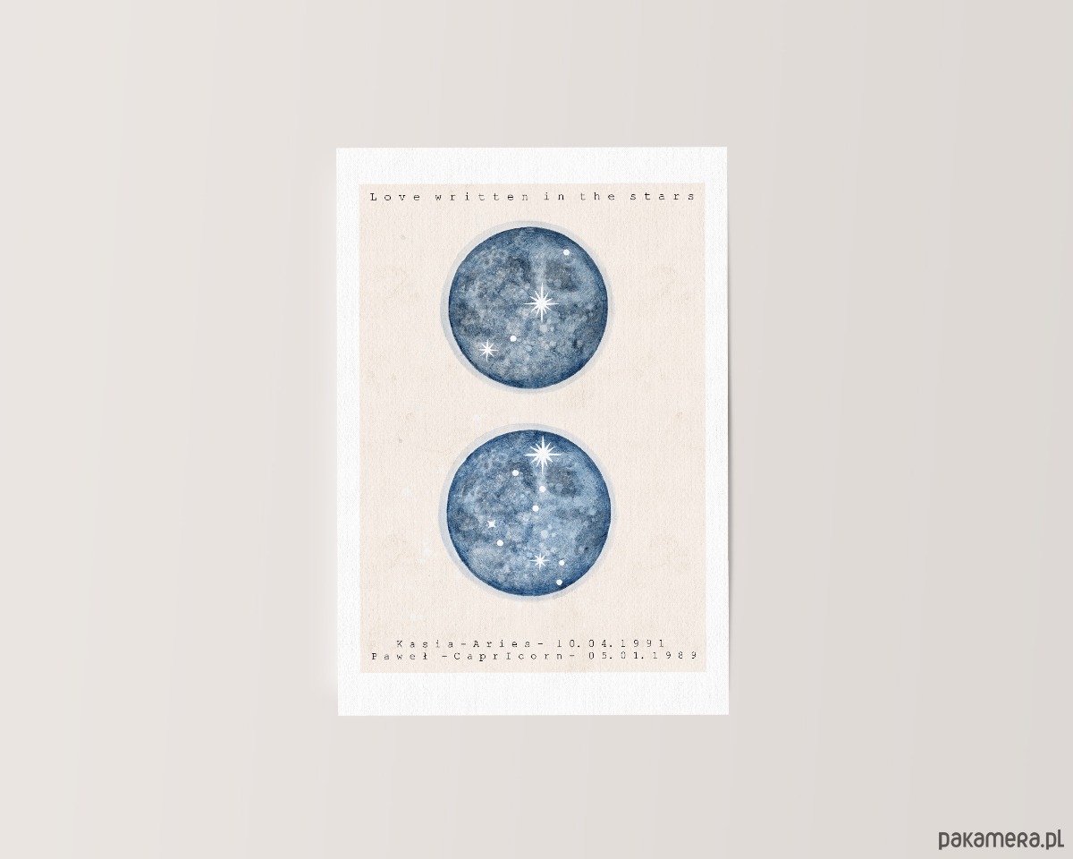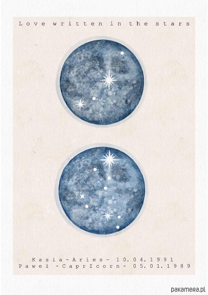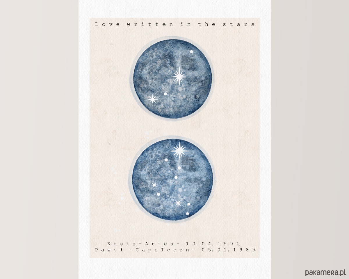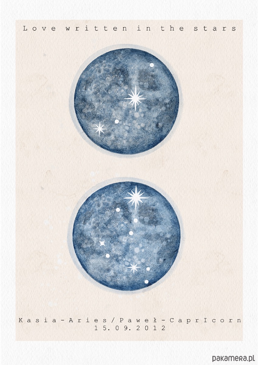 Minimalistyczny rysunek przedstawiający dwie wybrane konstelację gwiezdne z napisem „ Love written in the stars”