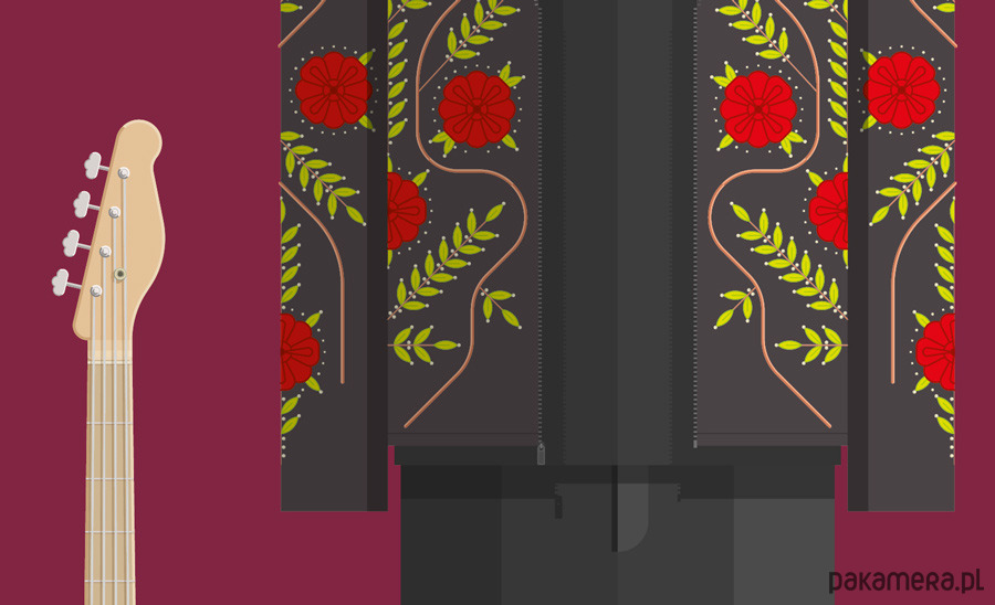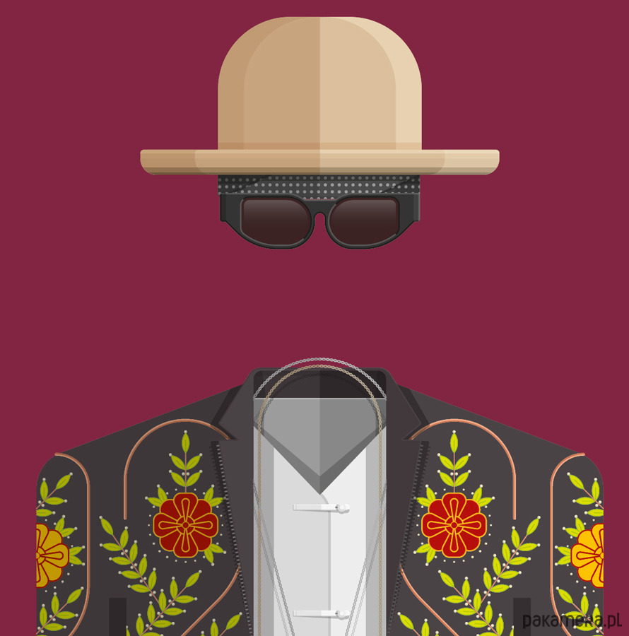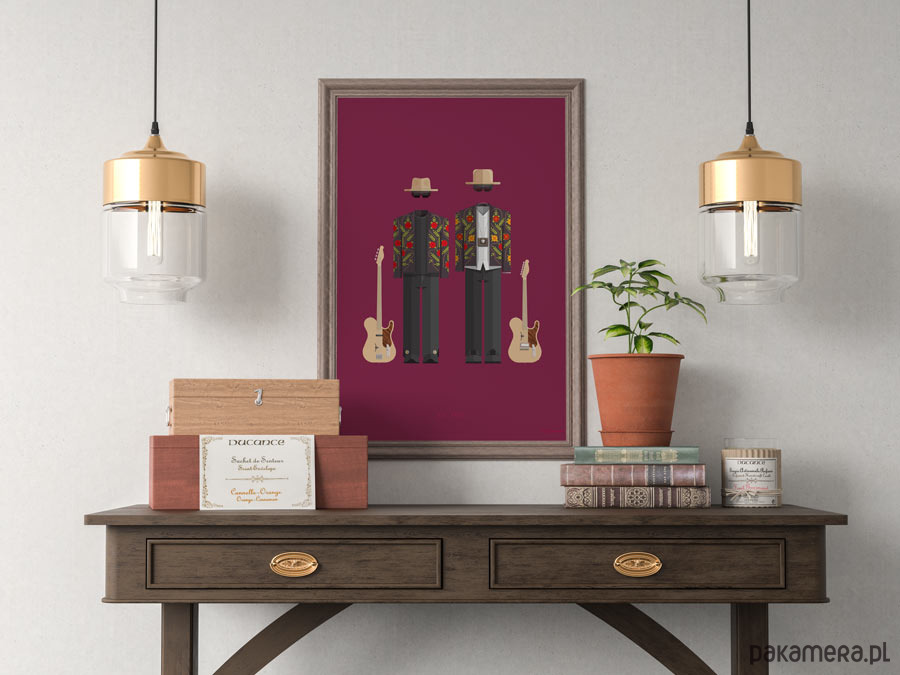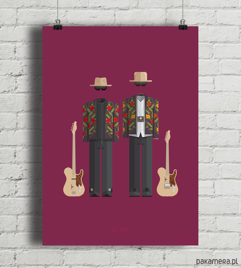 Plakat z autorską grafiką inspirowany rockową grupą ZZ Top. Pochodzi z serii "Kostiumy muzyczne" i przedstawia groteskowe stroje artystów - kapelusze, obfite koszule, okulary przeciwsłoneczne, workowate spodnie i kurtki w stylu meksykańskich mariachi.