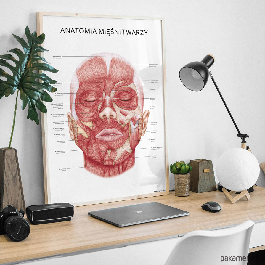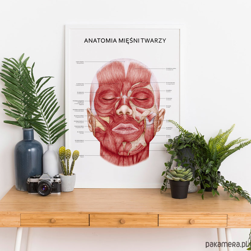 Plakat przedstawia mięśnie mimiczne wraz z podpisami.