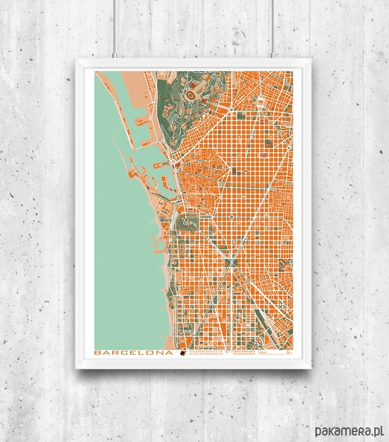 Plan Barcelony skoncentrowany wokół modernistycznej dzielnicy „Ensanche” (kat. Eixample), zbudowanej według projektu Ildefonso Cerdá. Ramę planu stanowią wzgórze Montjuic, końcowy fragment Avenida Diagonal i Ronda del Mig. Pomiędzy nimi znajdują się główne atrakcje miasta, m.in. Sagrada Familia, Dzielnica Gotycka, Torre Agbar, Palau Sant Jordi, wyróżnione brązowym kolorem.
