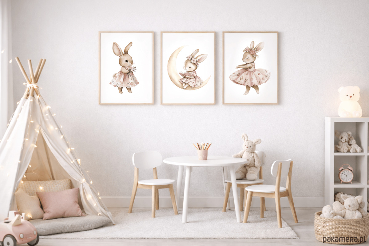 Subtelny zestaw trzech plakatów z króliczkami w romantycznej, pastelowej odsłonie. Ilustracje utrzymane są w delikatnym, akwarelowym stylu z ciepłymi beżami i pudrowym różem, które tworzą spokojną, harmonijną atmosferę w dziecięcym wnętrzu.
