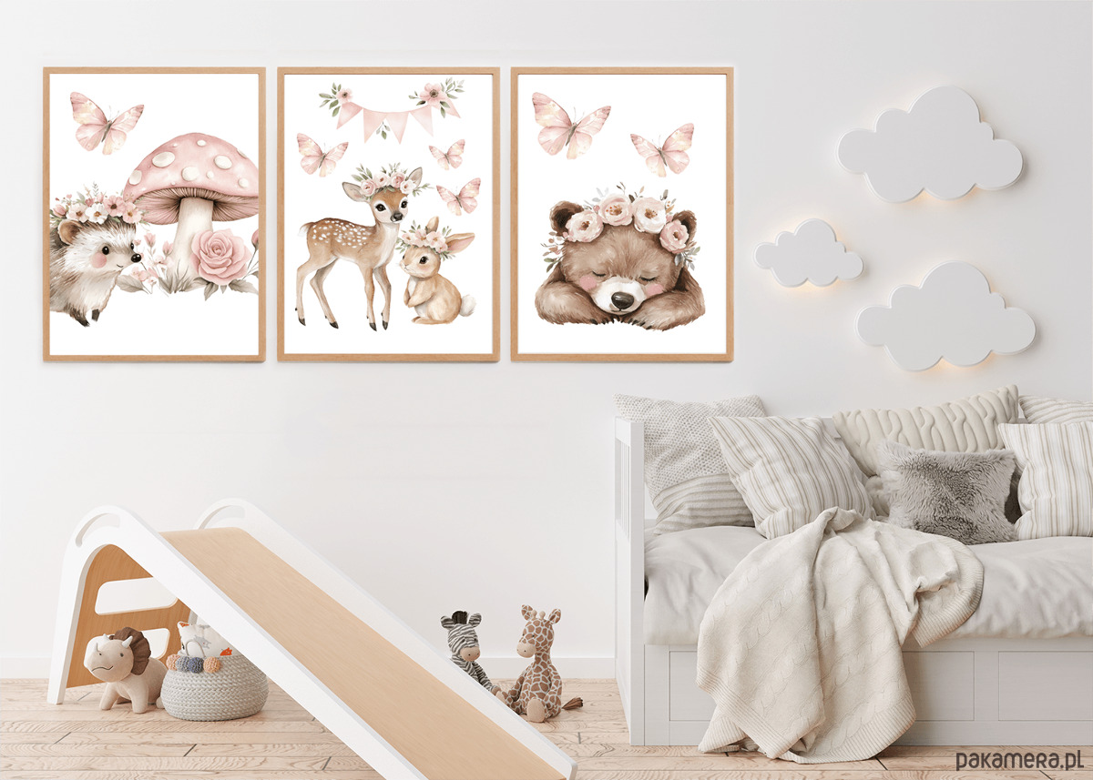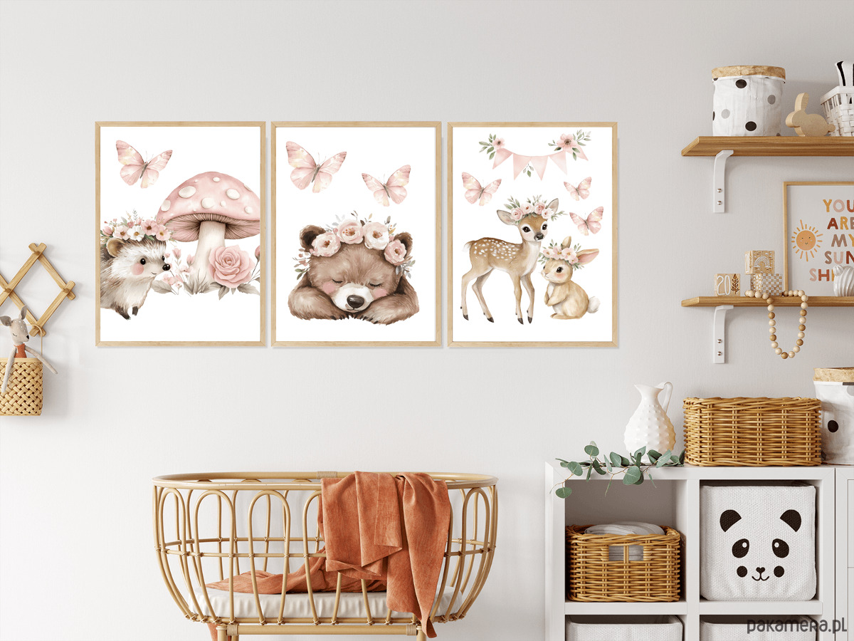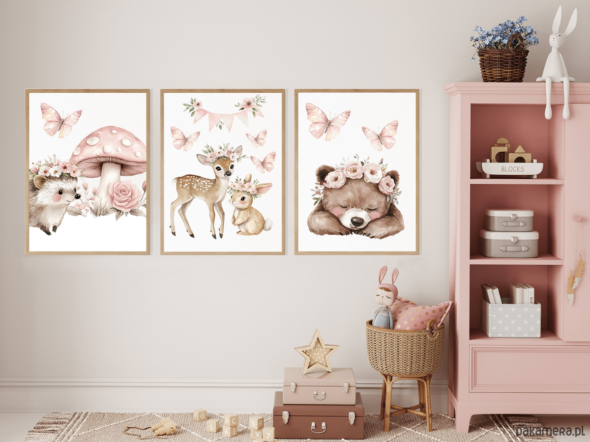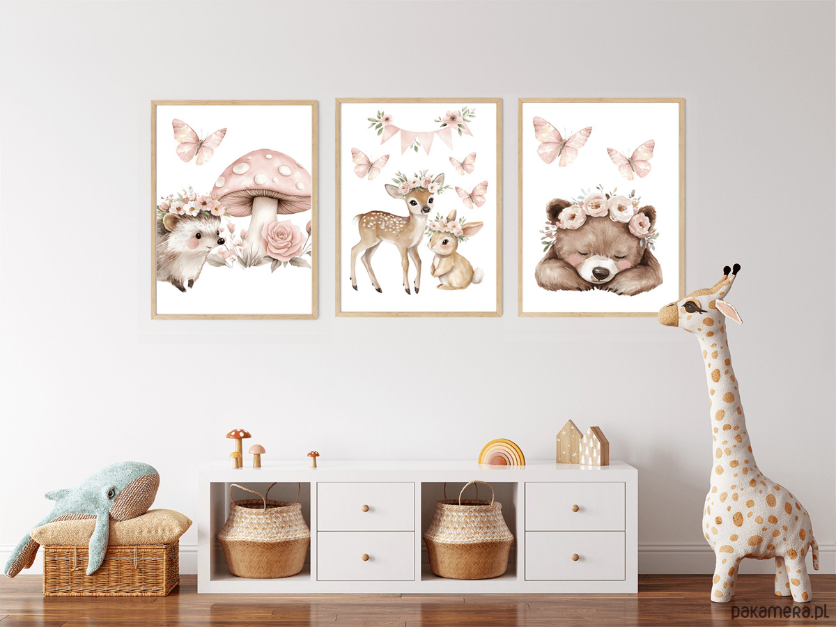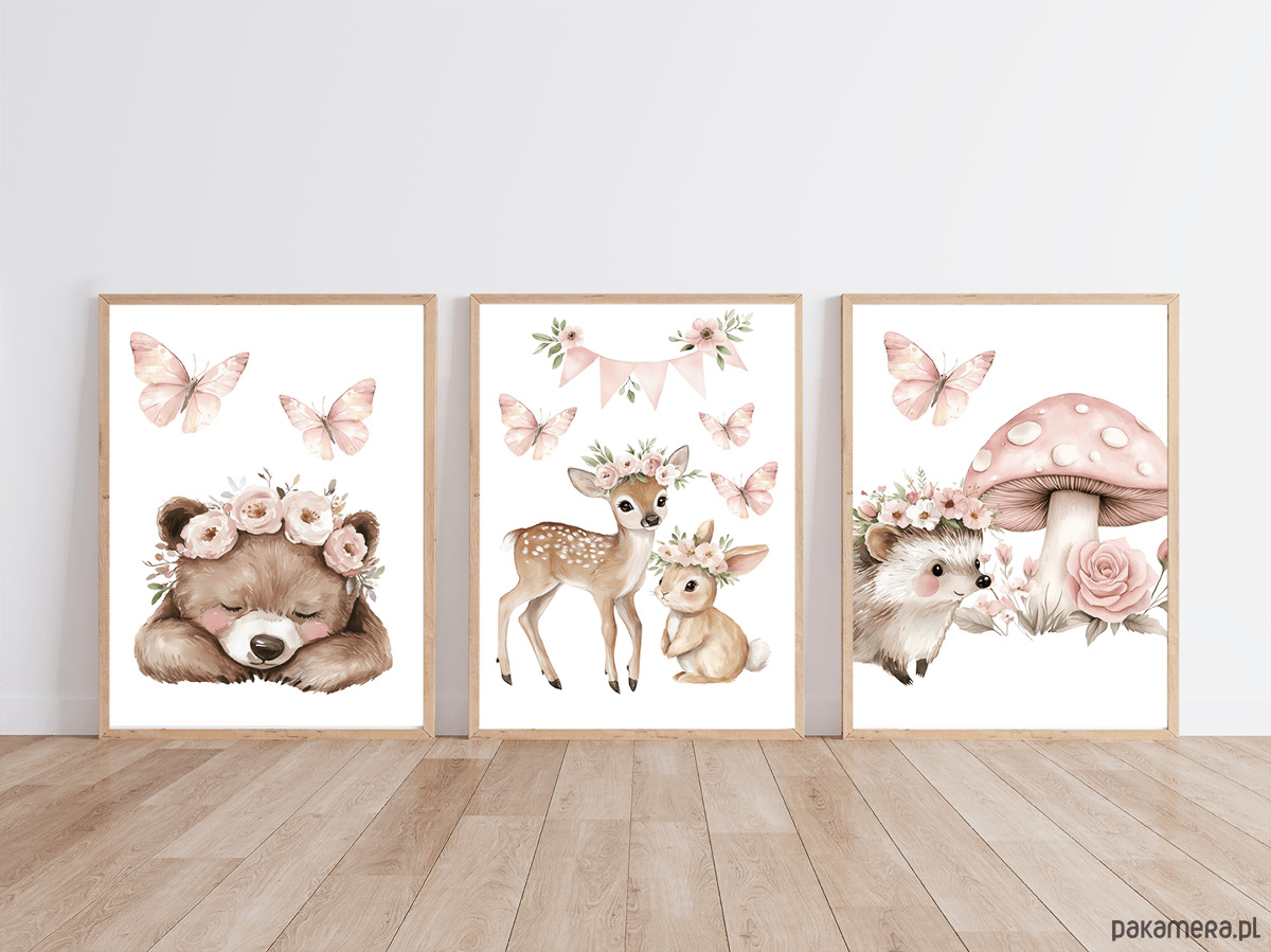 Uroczy, subtelny zestaw trzech plakatów z leśnymi zwierzątkami w romantycznej, pastelowej odsłonie. Ilustracje utrzymane są w delikatnym, akwarelowym stylu, z dominacją pudrowego różu, ciepłych beży i naturalnych brązów.