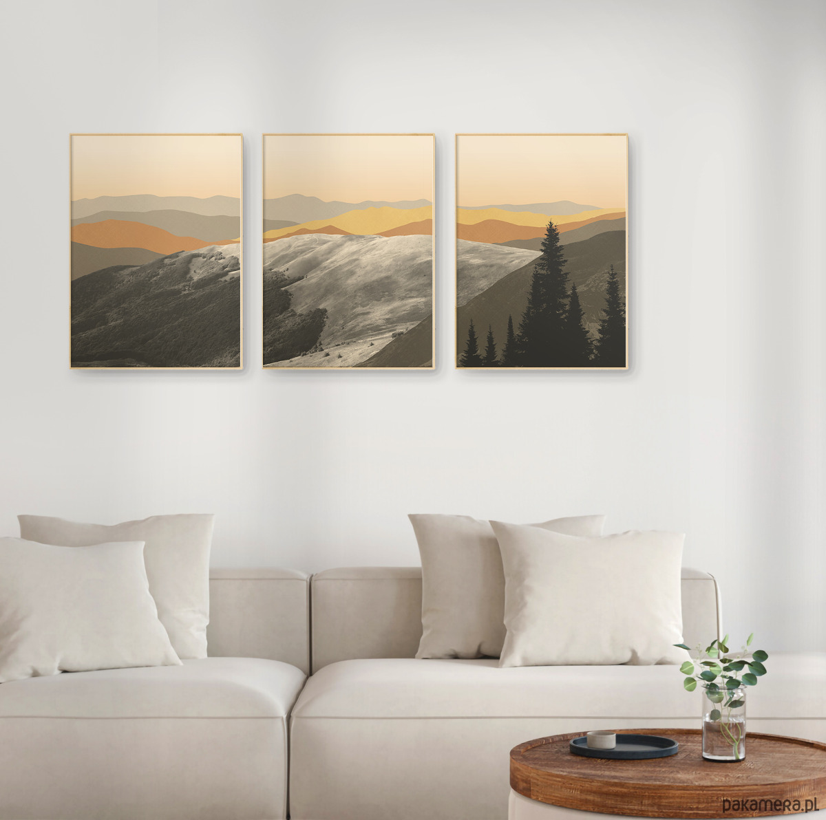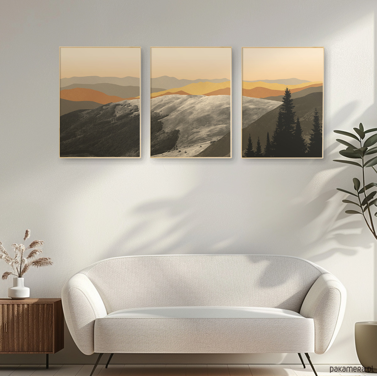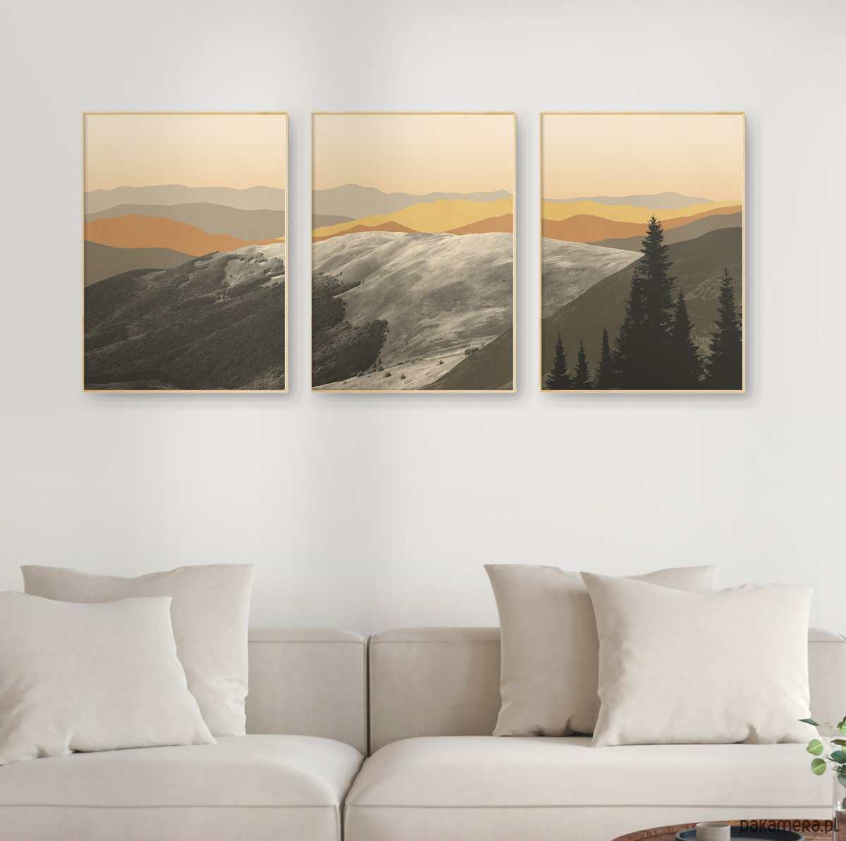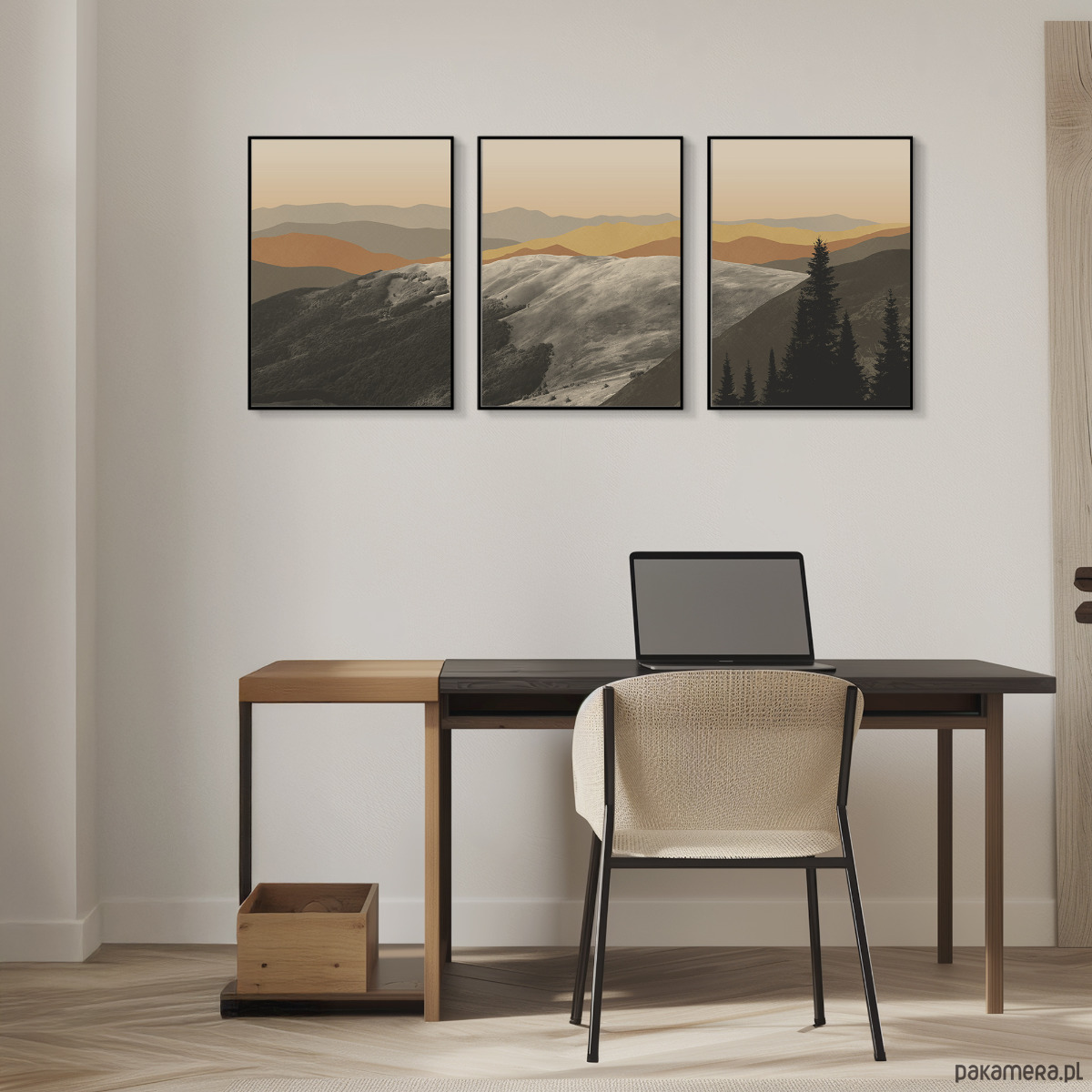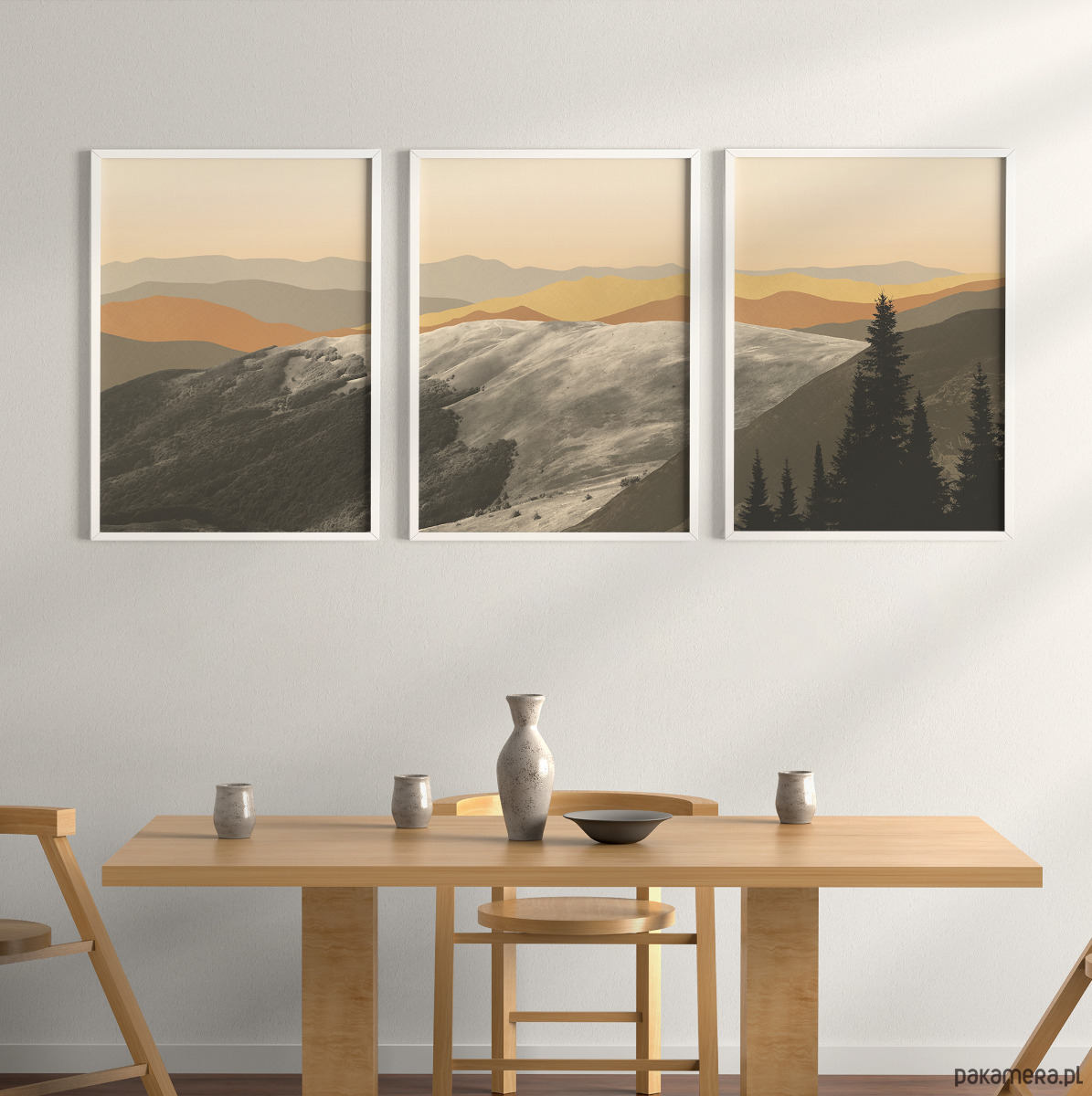 Abstrakcyjny zestaw 3 plakatów w formie tryptyku z wizerunkiem Bieszczad w nowoczesnym wydaniu mid-century. Połączenie realistycznej fotografii gór z geometrycznymi warstwami kolorów nadaje kompozycji elegancki, designerski charakter.