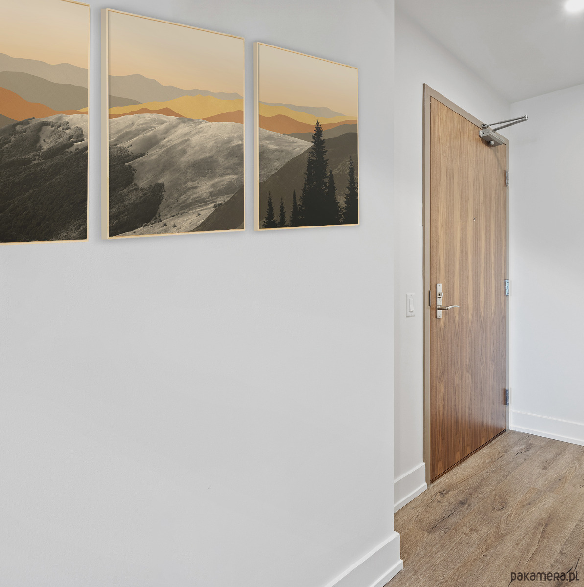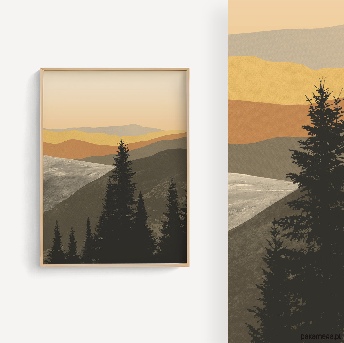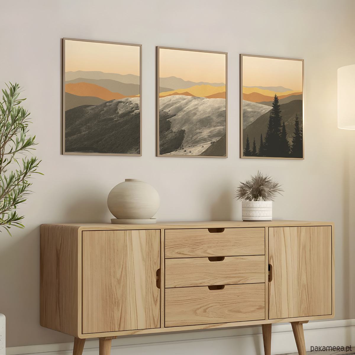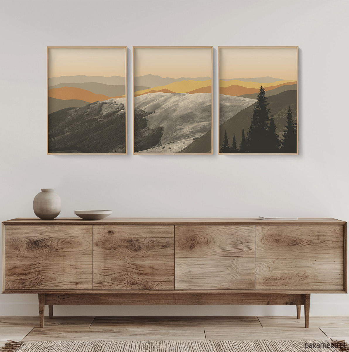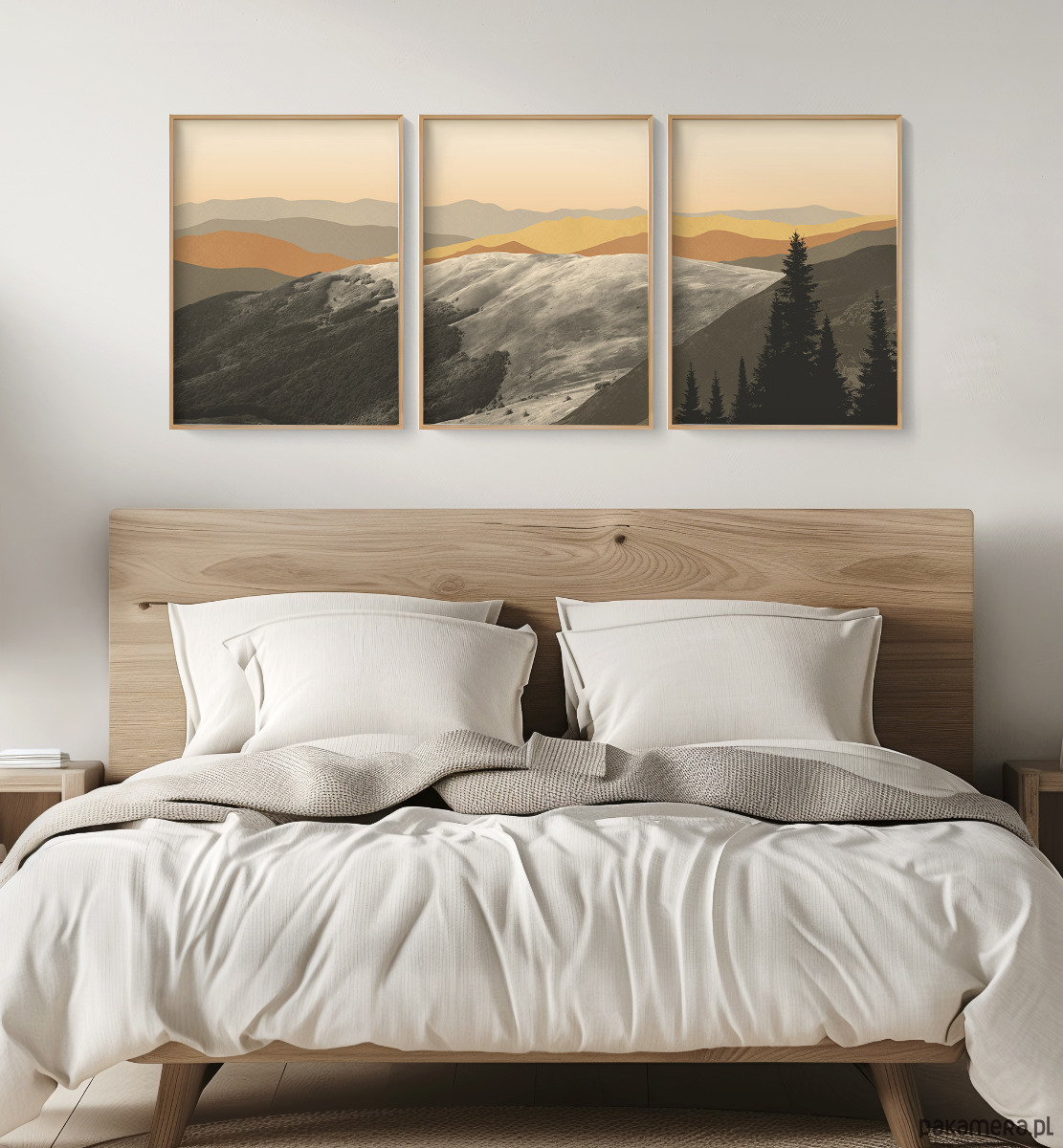 Abstrakcyjny zestaw 3 plakatów w formie tryptyku z wizerunkiem Bieszczad w nowoczesnym wydaniu mid-century. Połączenie realistycznej fotografii gór z geometrycznymi warstwami kolorów nadaje kompozycji elegancki, designerski charakter.