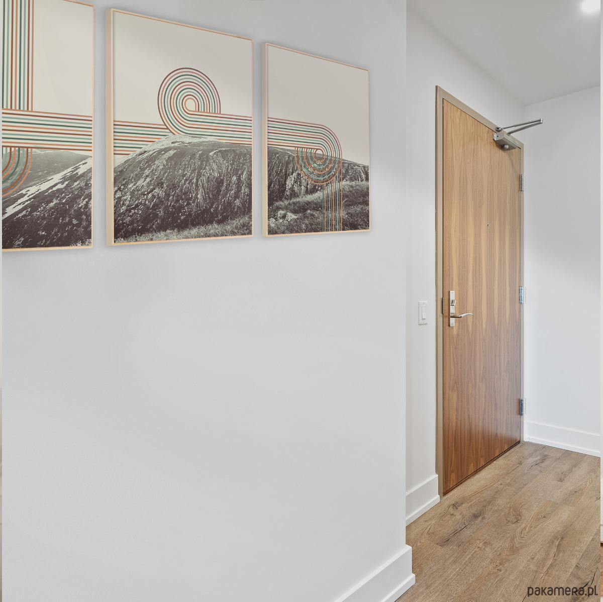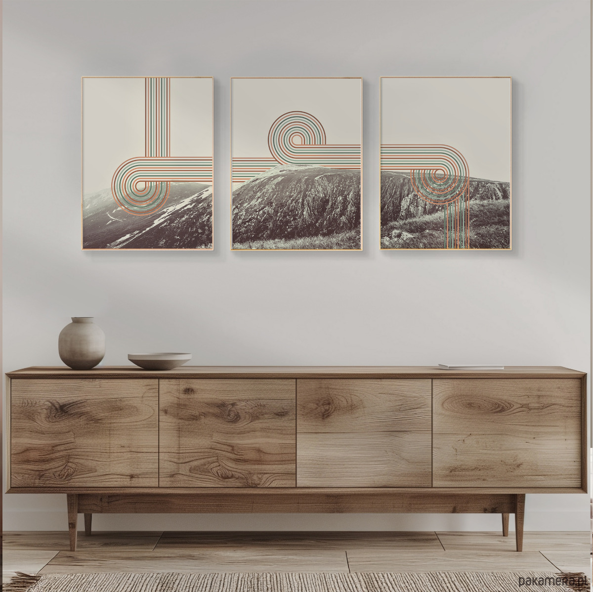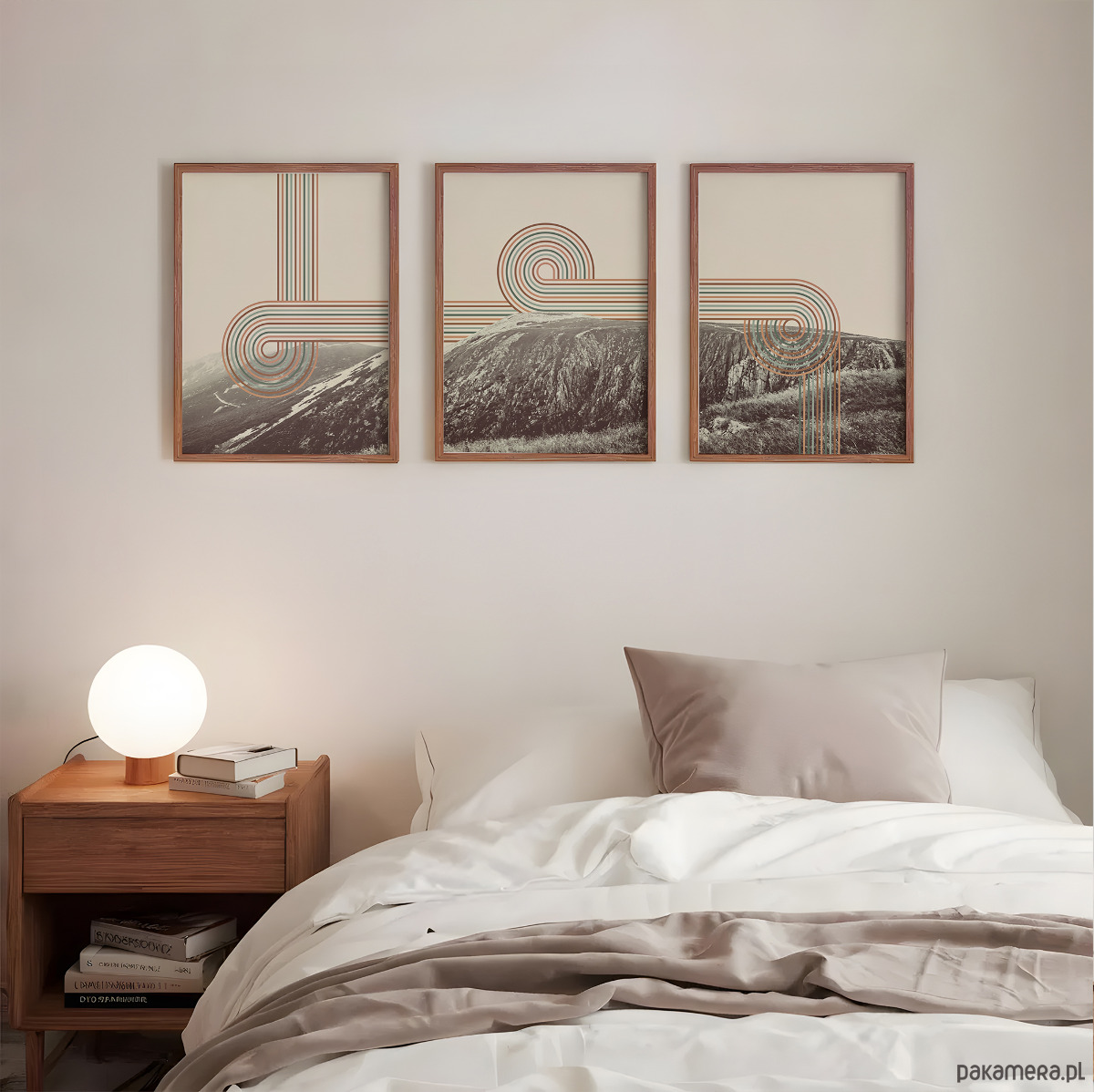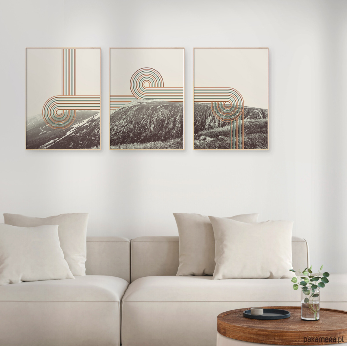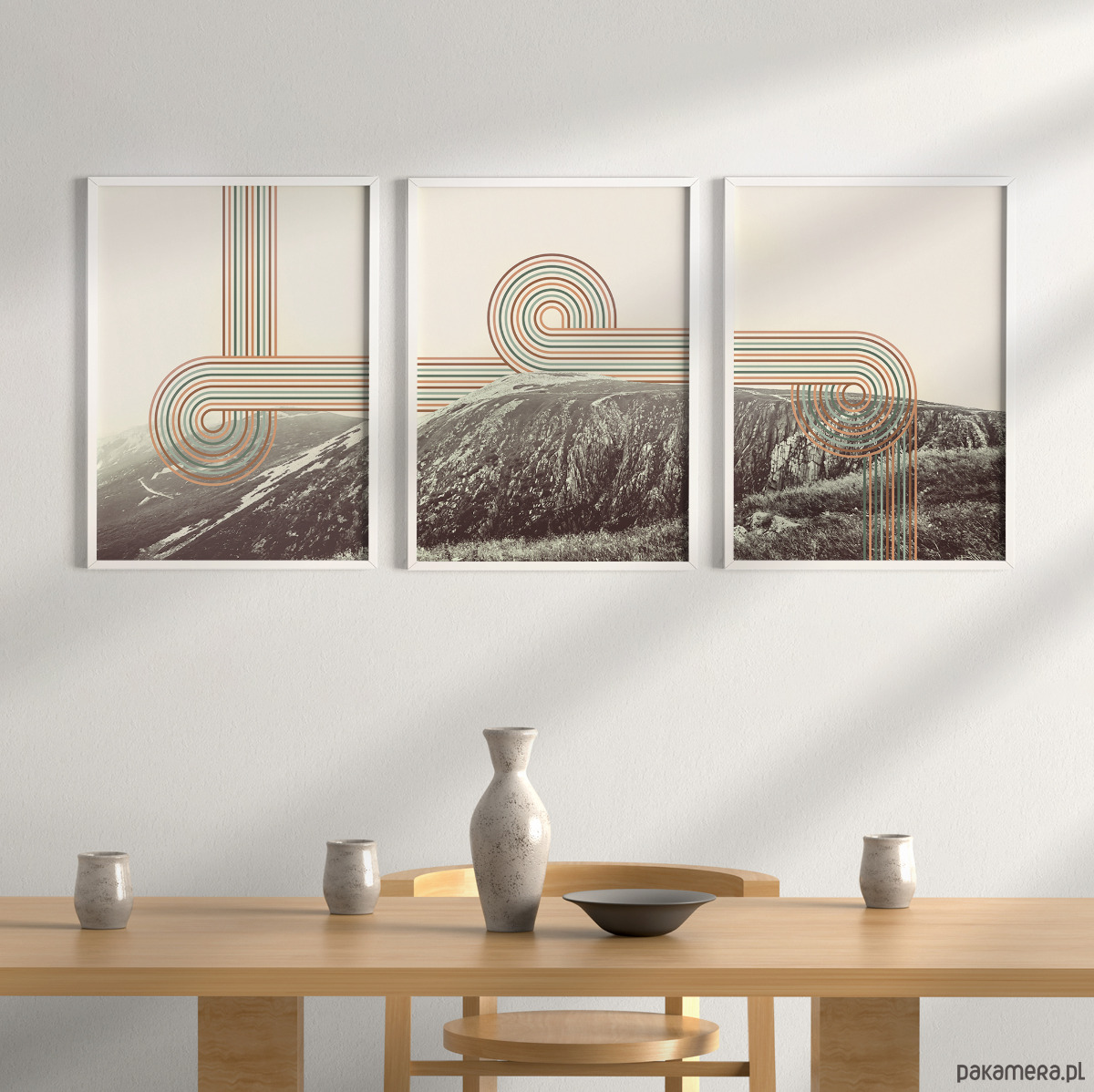 Zestaw trzech plakatów w formie tryptyku z wizerunkiem Karkonoszy z elementami grafiki retro. Ta oryginalna dekoracja w stylu mid-century, może świetnie odnaleźć się w nowoczesnych, minimalistycznych, czy też skandynawskich wnętrzach.