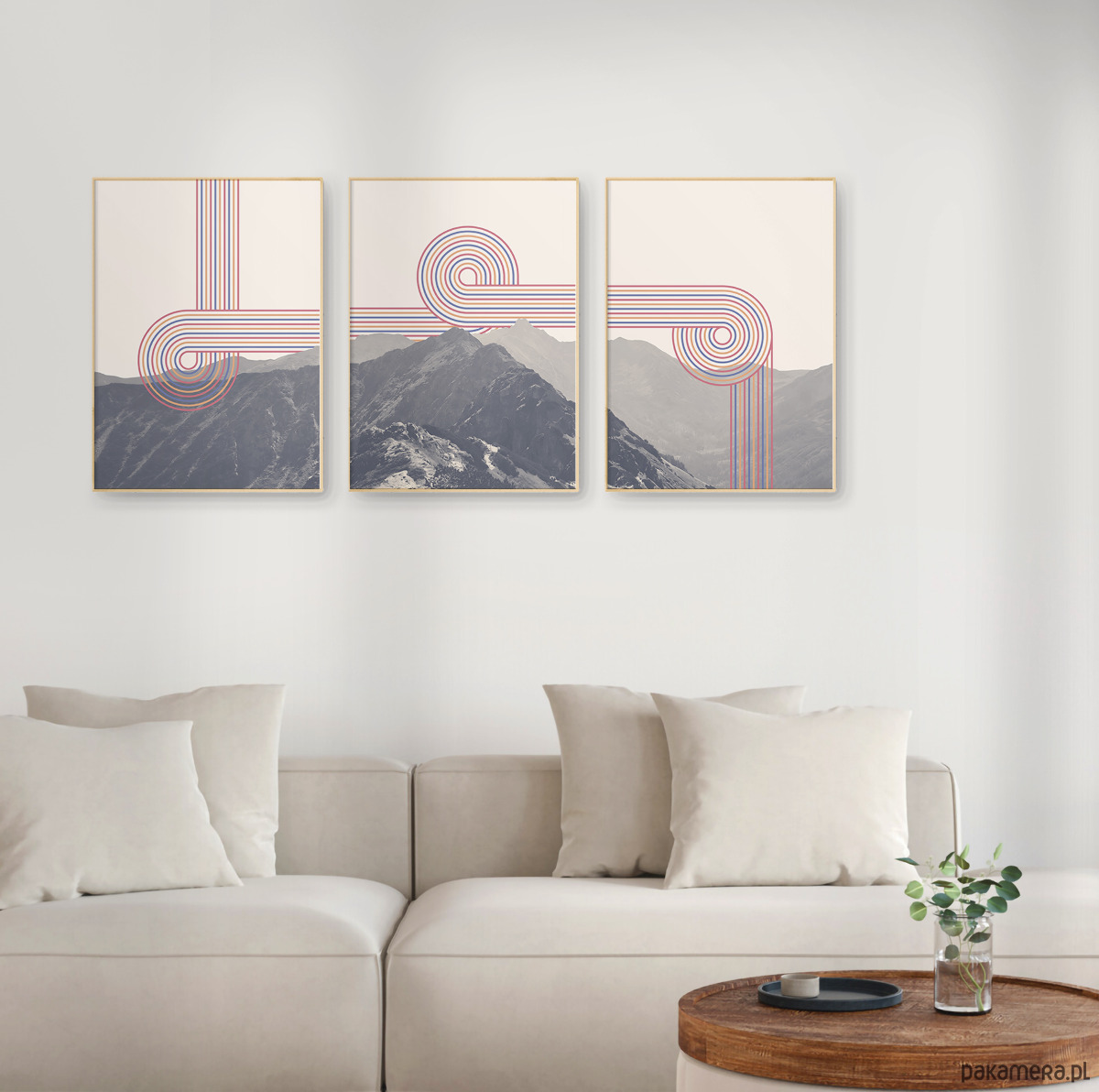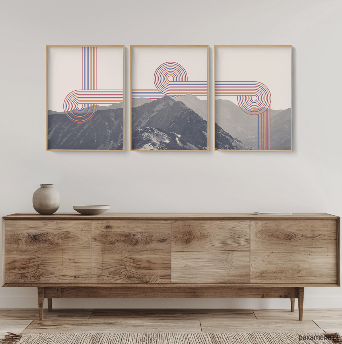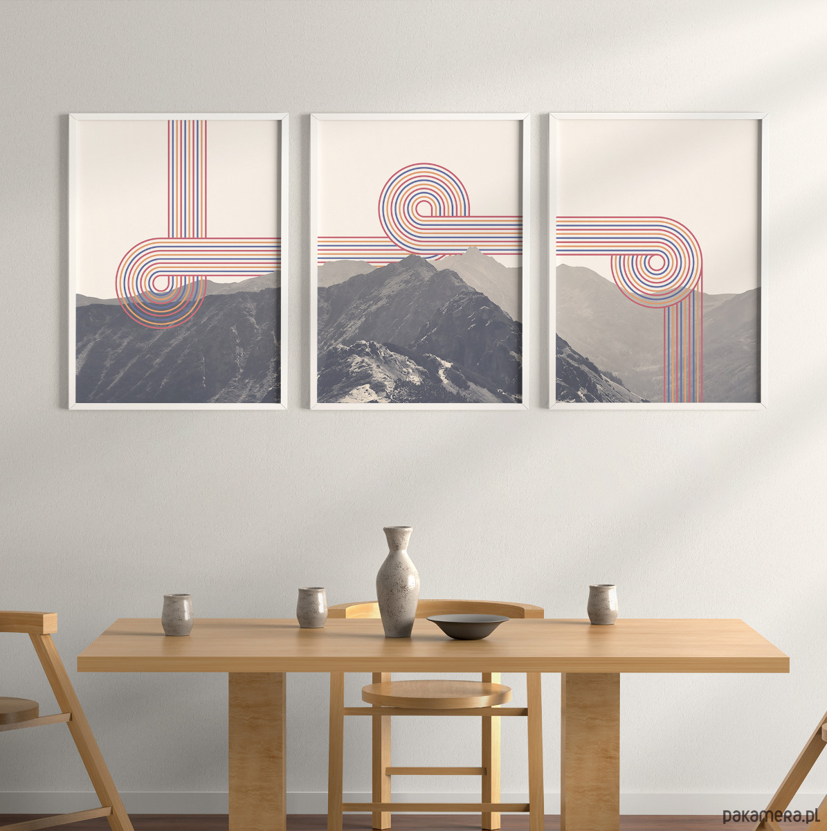 Zestaw trzech plakatów w formie tryptyku z wizerunkiem Tatr z elementami grafiki retro. Plakaty mogą stanowić świetną dekorację ścian w salonie, sypialni, przedpokoju czy też kuchni, dodając wnętrzu charakteru i naturalnego klimatu.