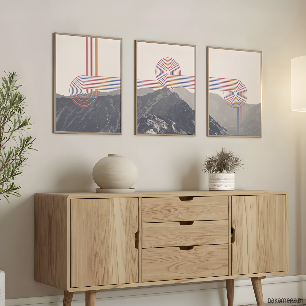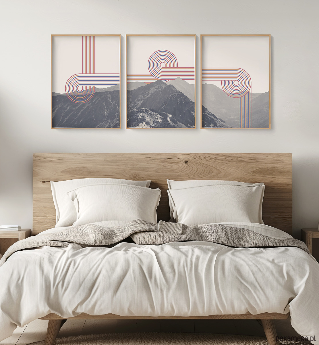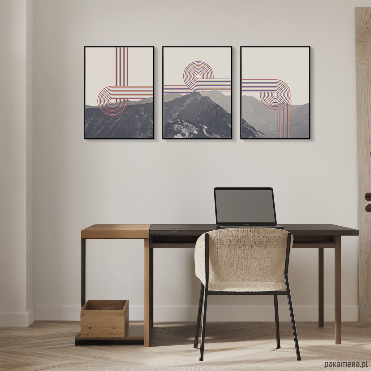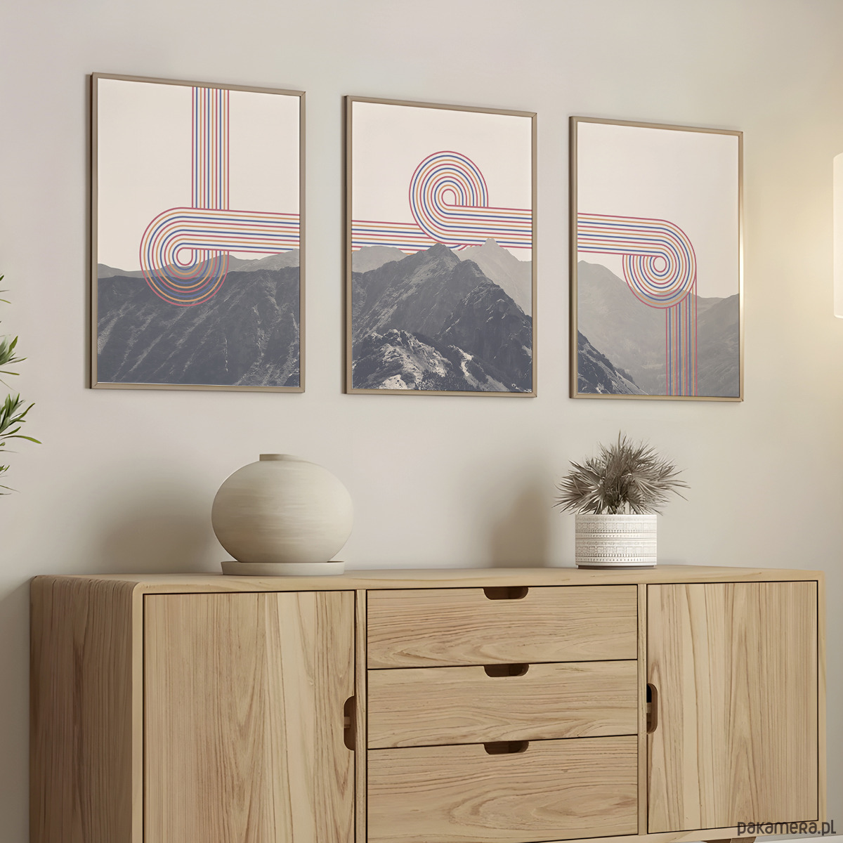 Zestaw trzech plakatów w formie tryptyku z wizerunkiem Tatr z elementami grafiki retro. Plakaty mogą stanowić świetną dekorację ścian w salonie, sypialni, przedpokoju czy też kuchni, dodając wnętrzu charakteru i naturalnego klimatu.