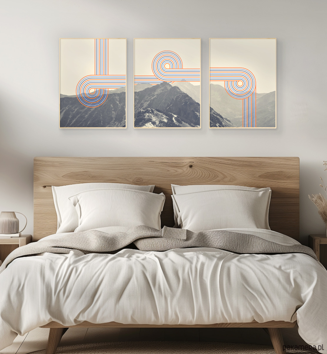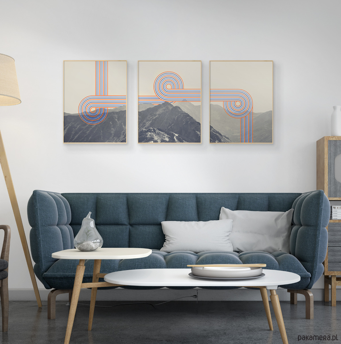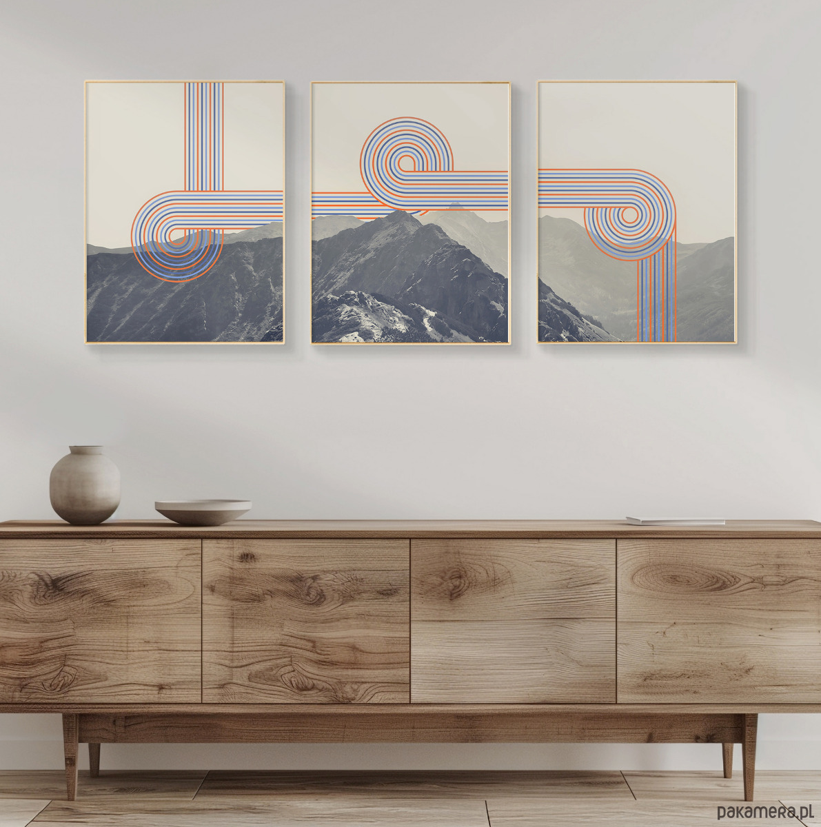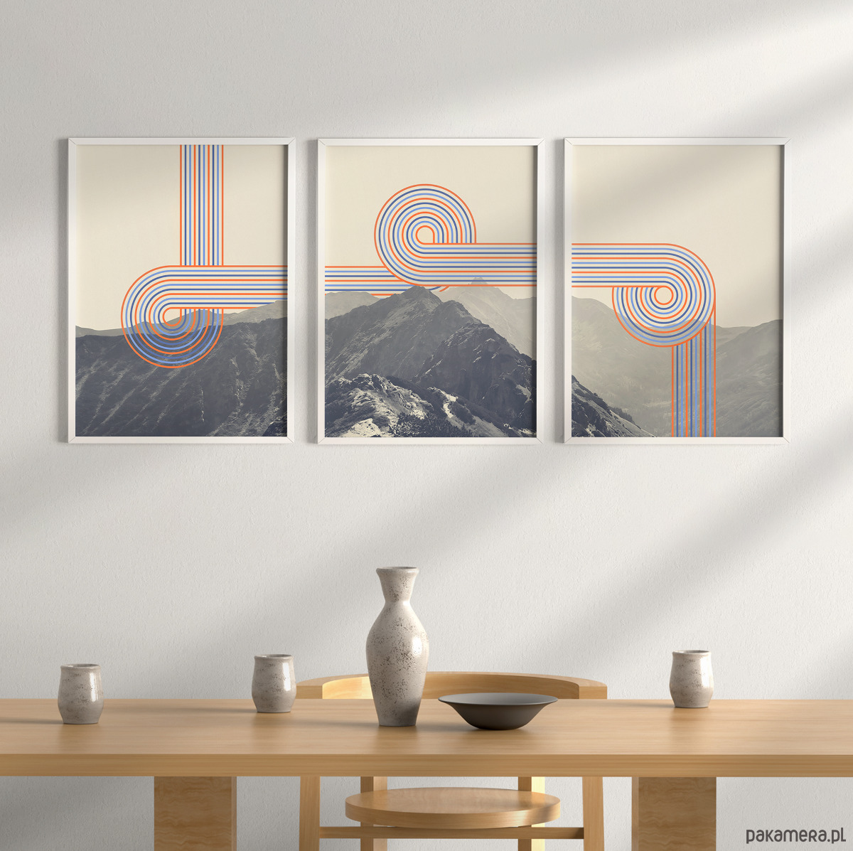 Zestaw trzech plakatów w formie tryptyku z wizerunkiem Tatr z elementami grafiki retro. Ta oryginalna dekoracja w stylu mid-century, może świetnie odnaleźć się w nowoczesnych, minimalistycznych czy też skandynawskich wnętrzach.