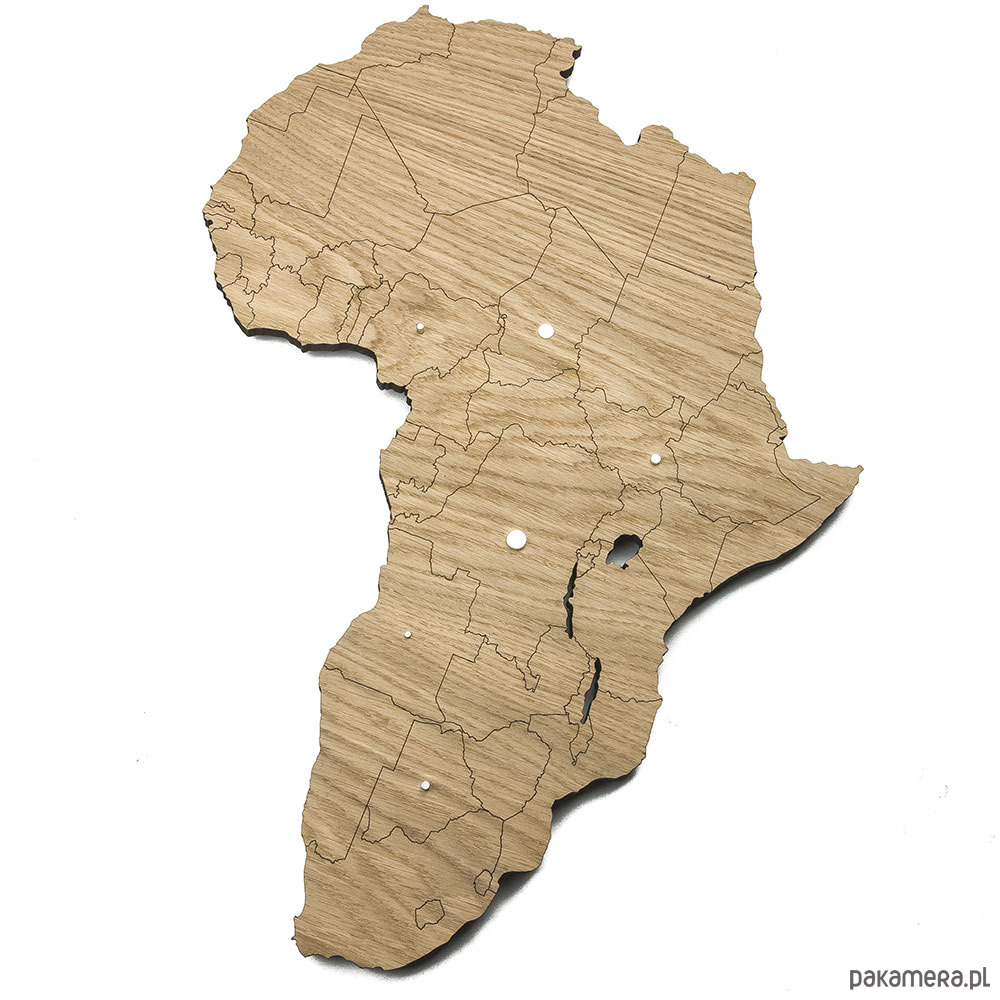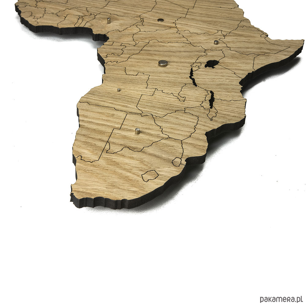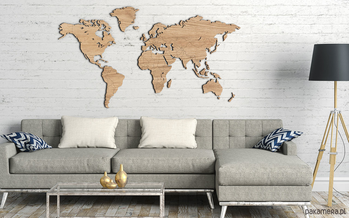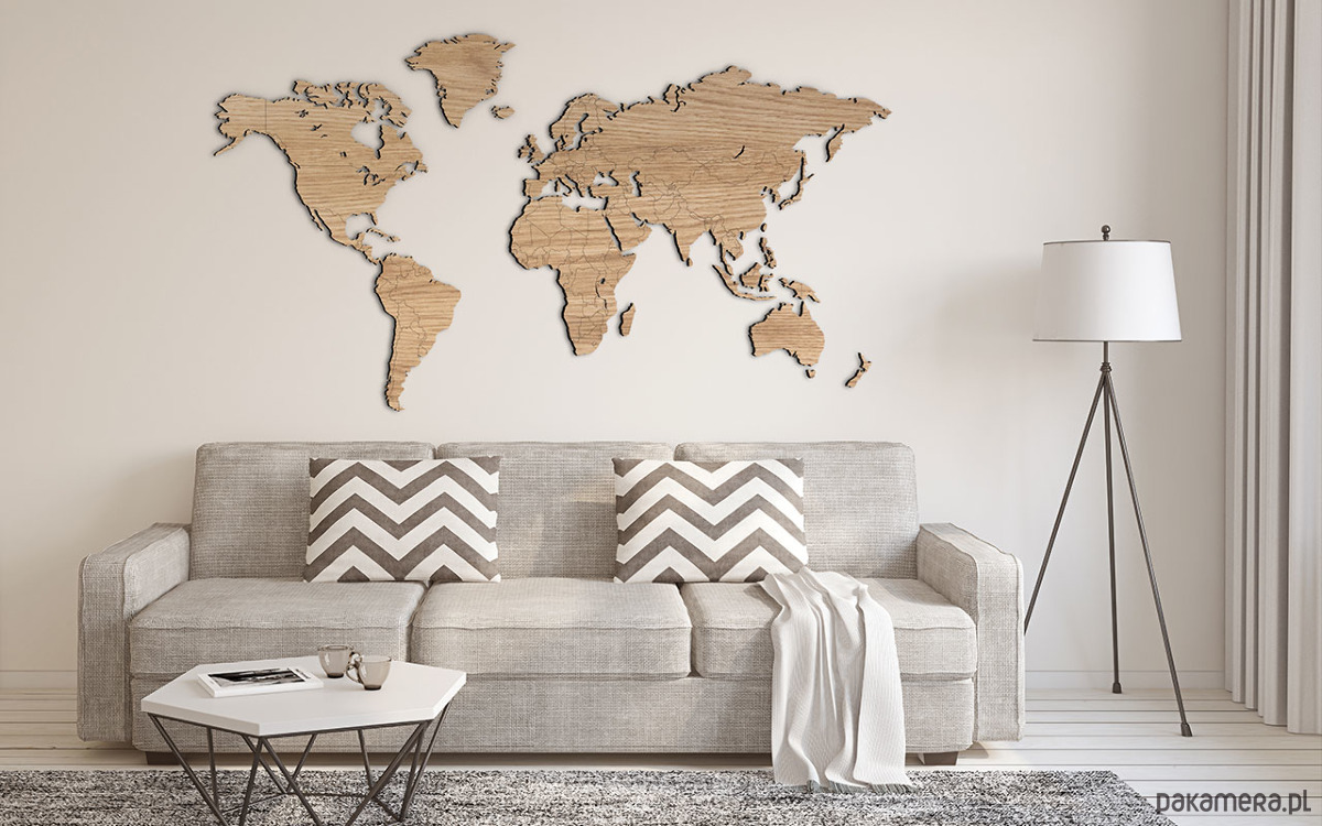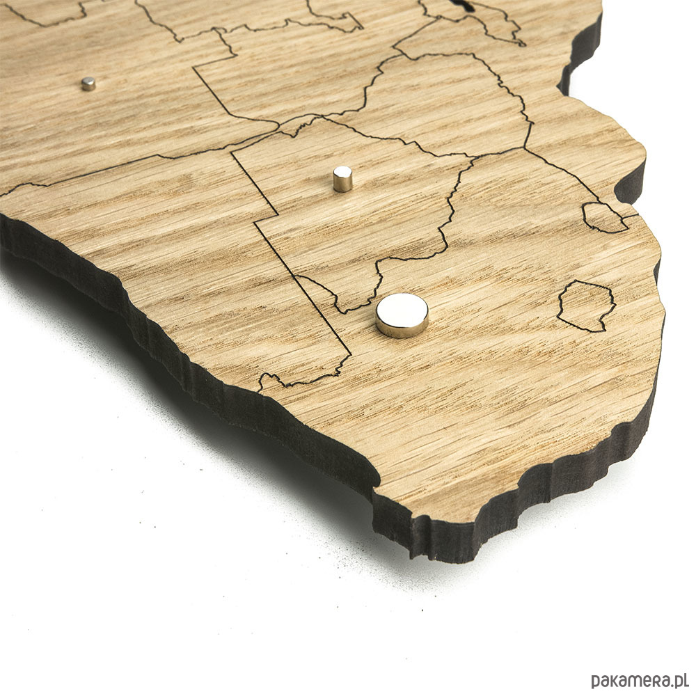 Elementy drewniane naszej mapy mają 10 mm grubości. Jej realne wymiary to 2000 mm szerokości i 1180 mm wysokości. Aby ułatwić jej montaż przygotowaliśmy drukowaną w dużym formacie instrukcję dokładnie odzwierciedlającą rozmieszczenie poszczególnych kontynentów oraz wysp. Nasza mapa składa się z kilkudziesięciu oddzielnych elementów – ich montaż ułatwia magnetyczny system umożliwiający drobne korekty położenia poszczególnych fragmentów już po ich zamontowaniu. Dodatkowo opracowaliśmy innowacyjny sposób umieszczania magnetycznych znaczników bezpośrednio na powierzchni drewna. Dzięki niemu będziemy mieli możliwość zaznaczenia miejsc, które odwiedziliśmy, a nawet przypięcia zdjęć, które na pięknej drewnianej mapie utrwalą nasze wspomnienia z podróży.