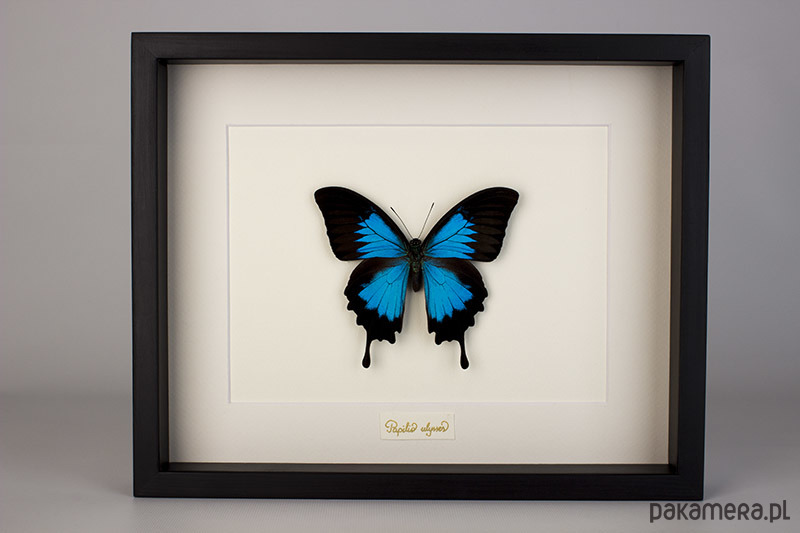 Kolor motyla: Oszałamiająco piękny motyl w kolorze niebieskim z czarnymi obwódkami skrzydeł. Na tylnych skrzydłach posiada dwa promieniste ogony.