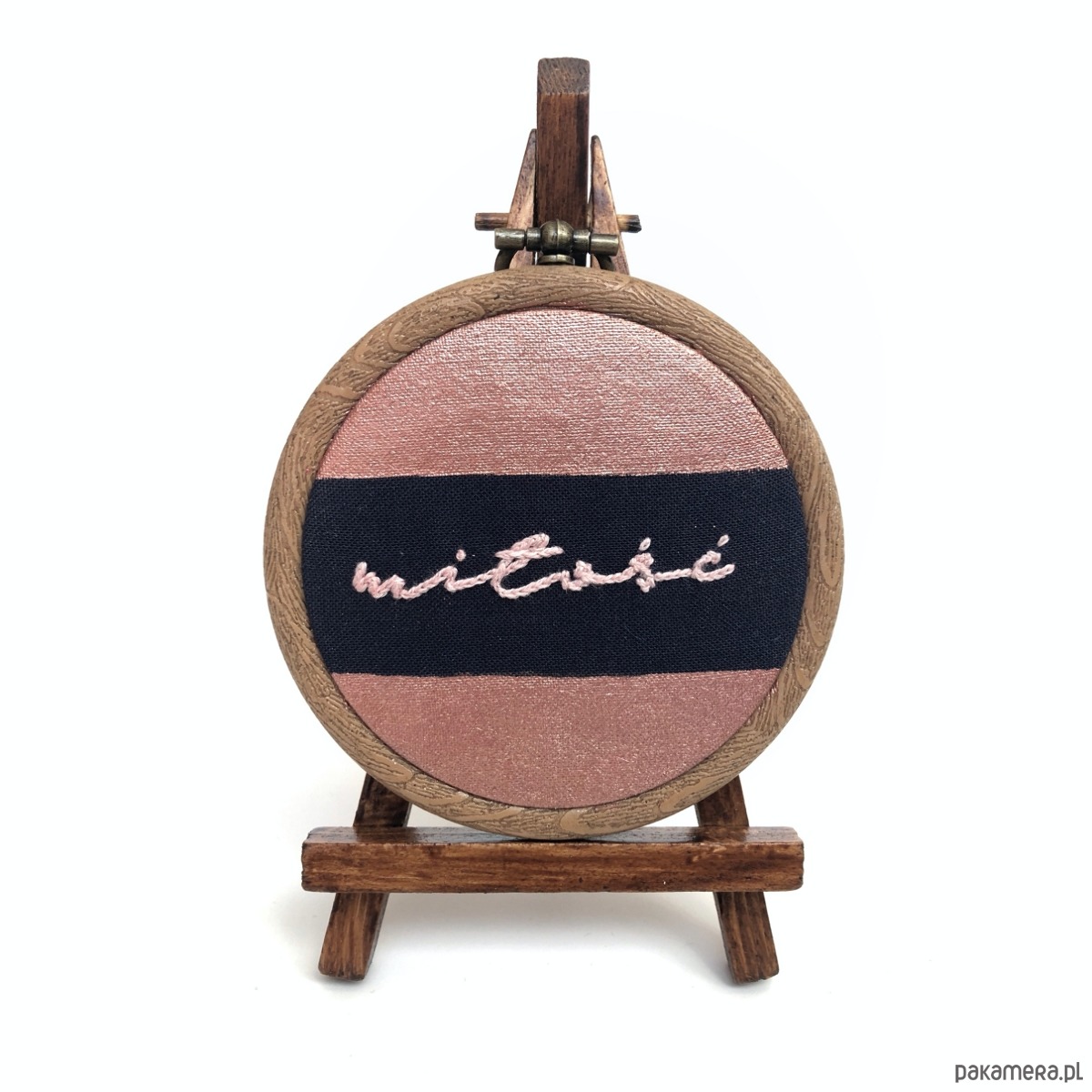 - Tamborek o średnicy 9 cm z ręcznie wyhaftowanym napisem "miłość" i namalowanymi elementami w kolorze różowego złota.