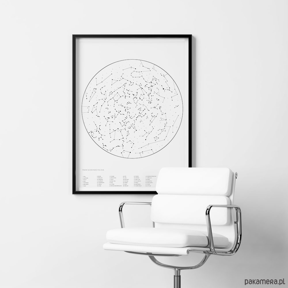 Mapa nieba nad Polską z 57 zaznaczonymi i opisanymi konstelacjami gwiazd.