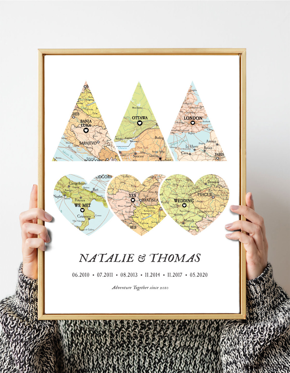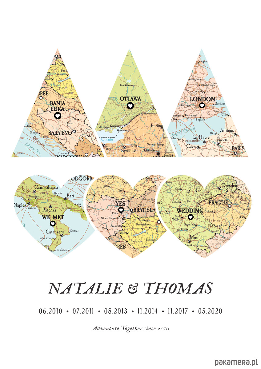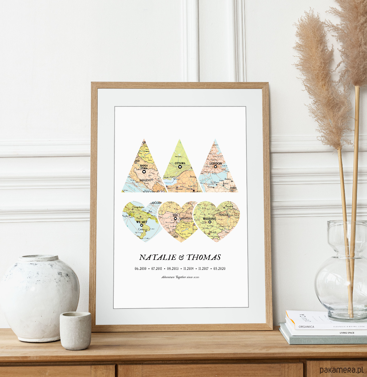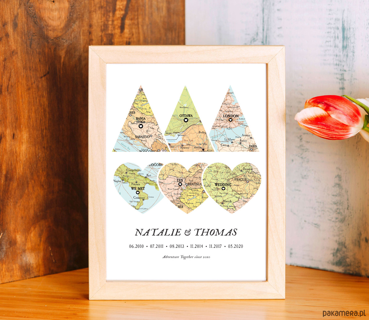 Unikatowy spersonalizowany plakat "Adventure Together since...." z miejscami, które są dla Ciebie ważne, przywołują piękne wspomnienia.