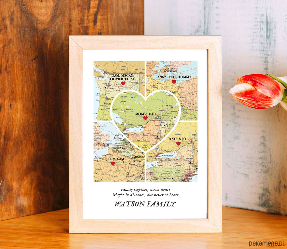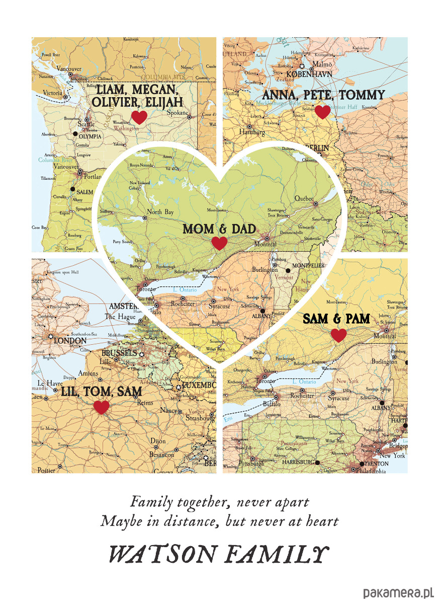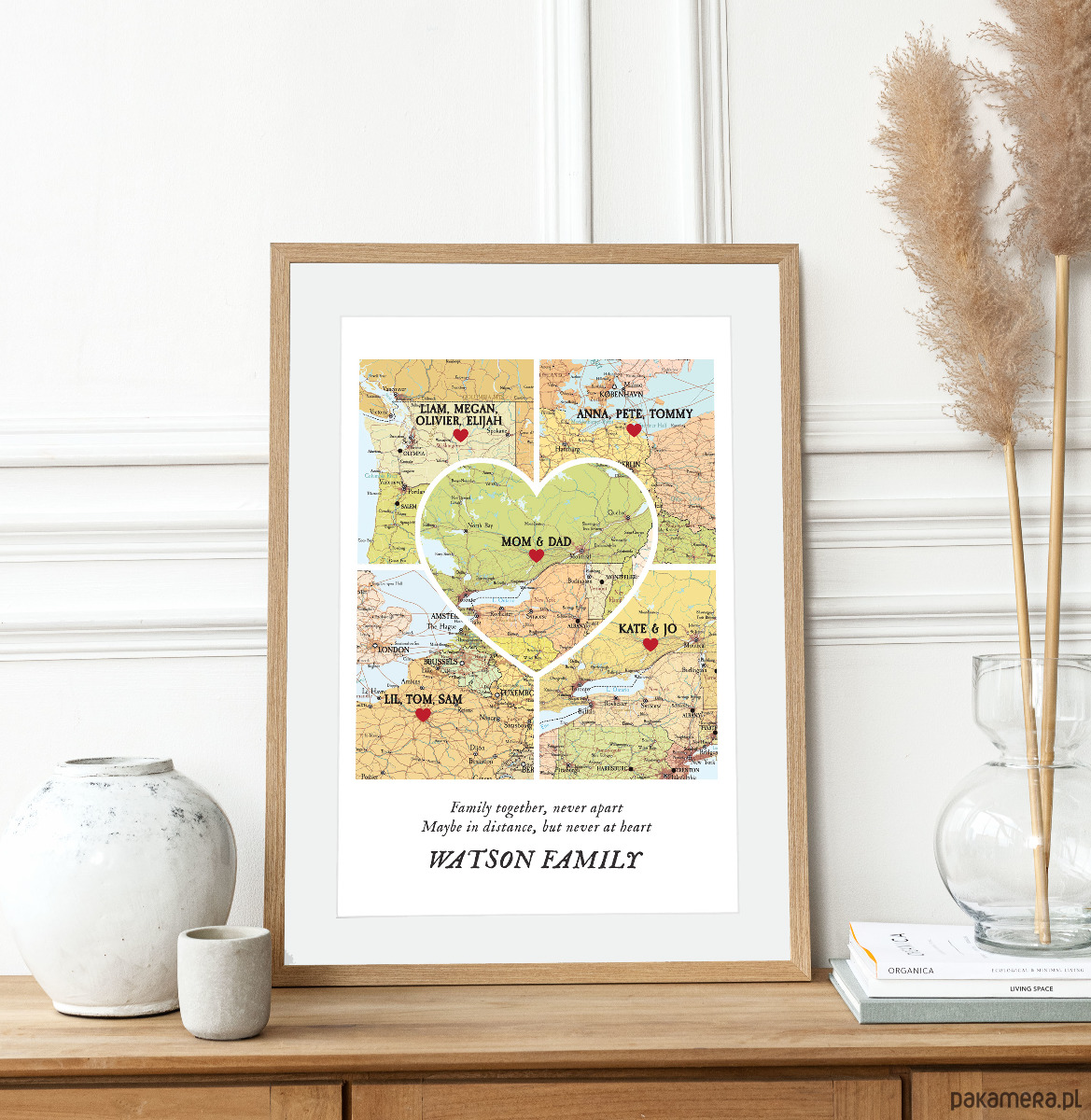 Unikatowy spersonalizowany plakat mapa z Twoimi lokalizacjami - miejscami gdzie mieszka Twoja rodzina.
