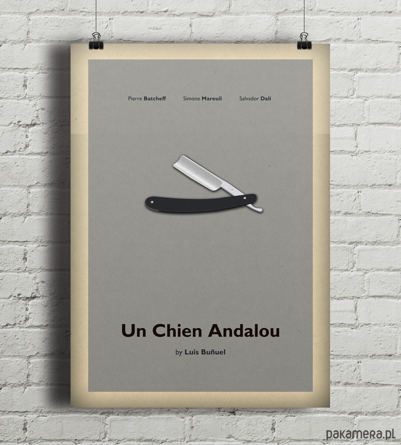 Plakat z autorską grafiką inspirowaną filmem Pies anadaluzyjski (Un chien anadalou) w reżyserii Luisa Bunuela, przy współpracy z Salvadorem Dalim.