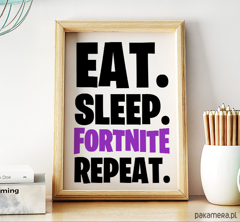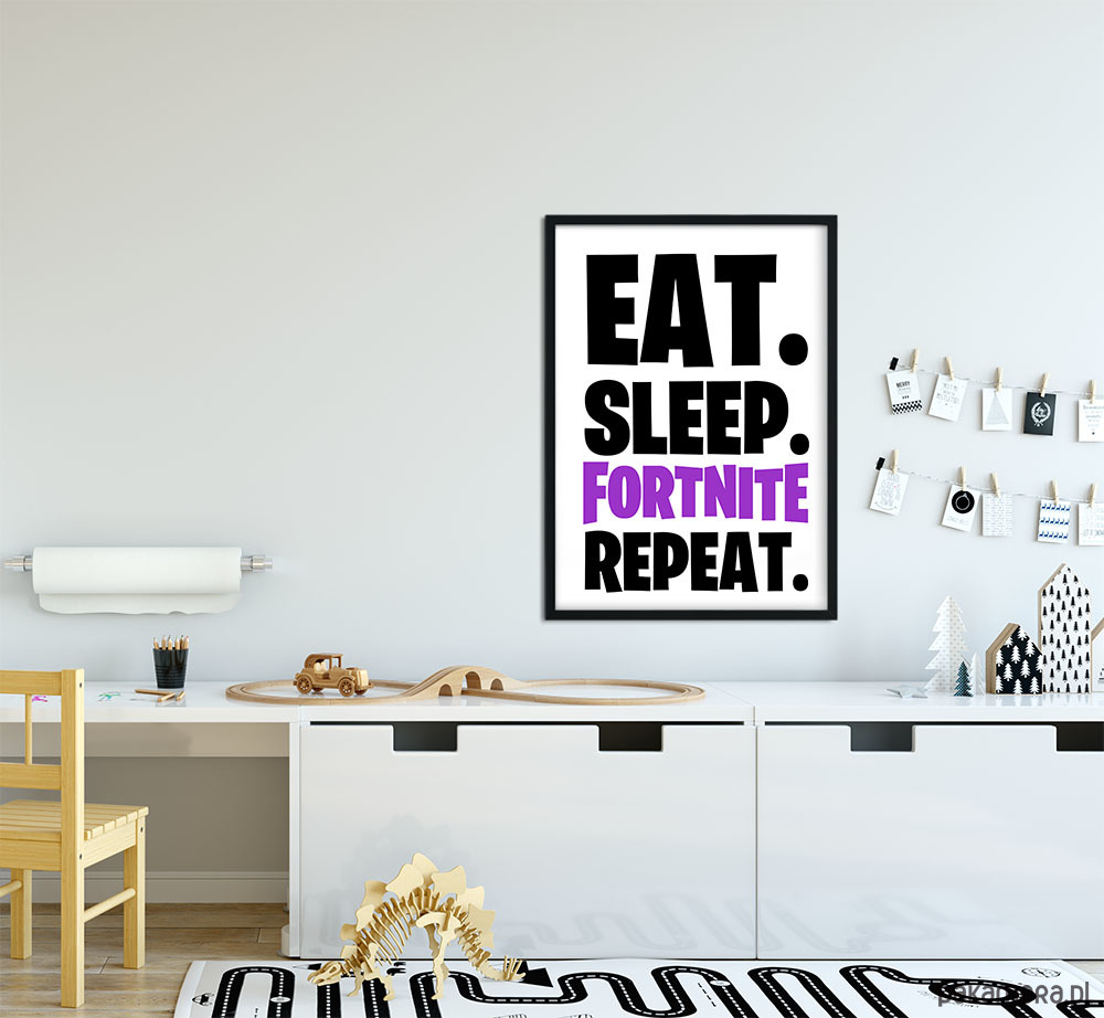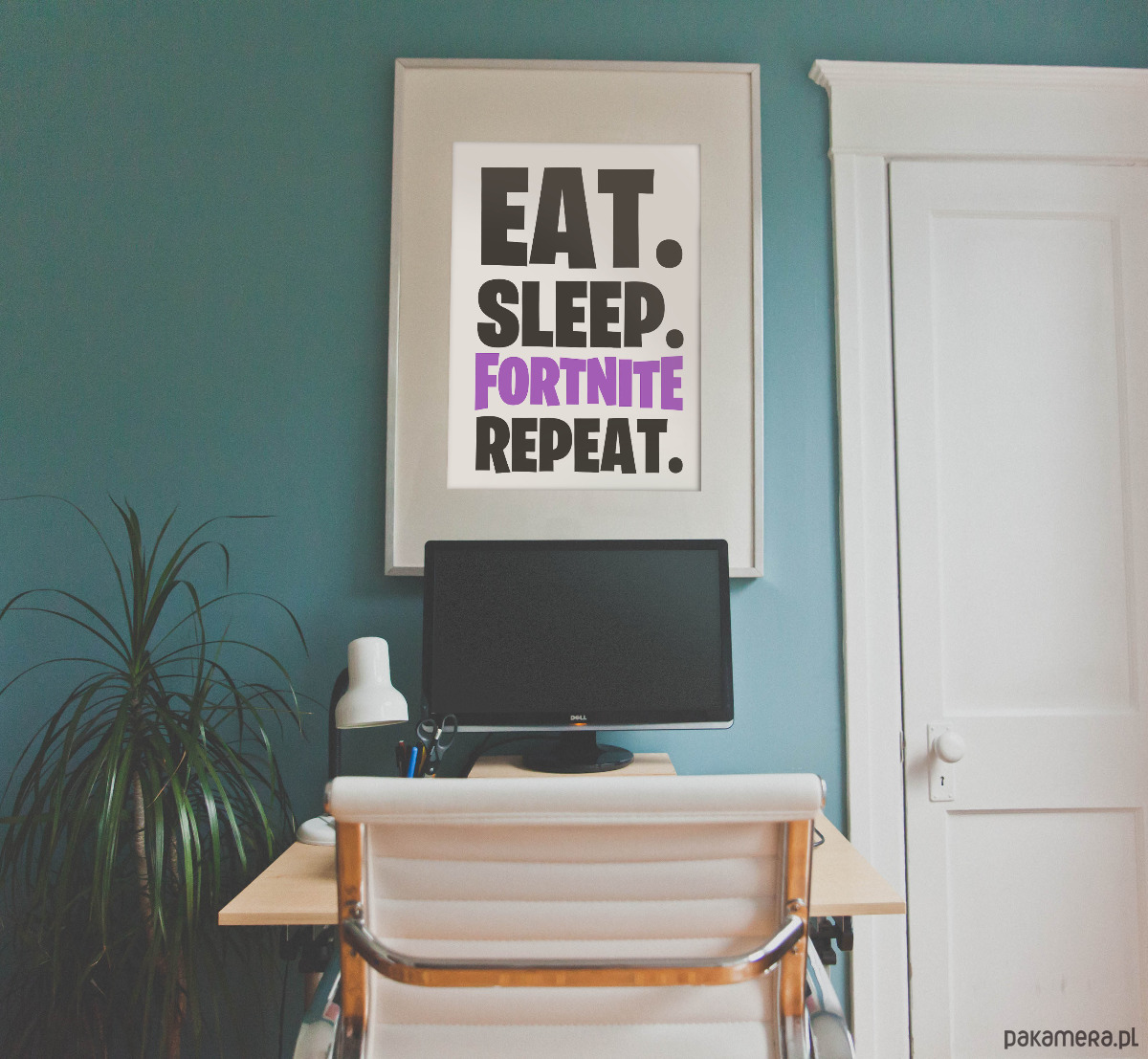 Na plakacie znajdują się napis: Eat. Sleep. Fortnite. Repeat.