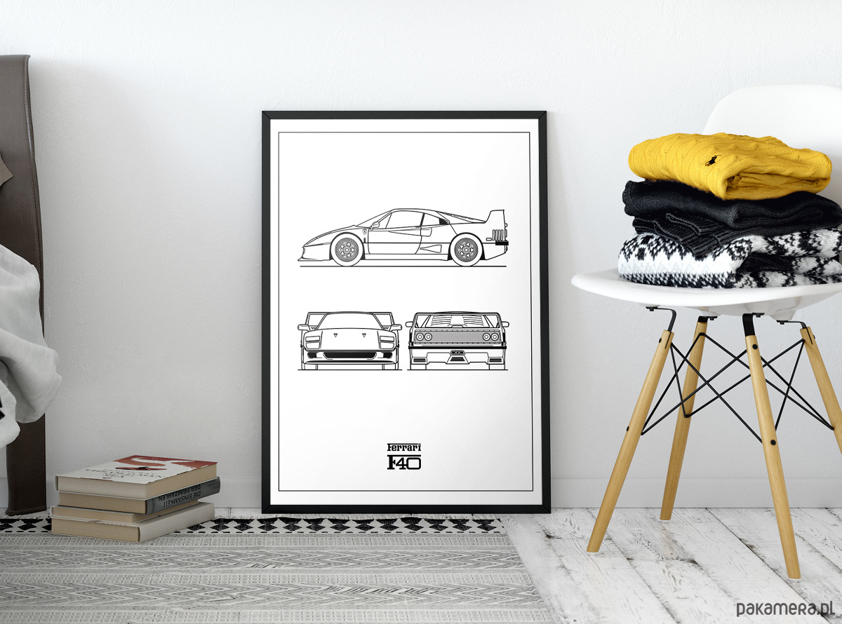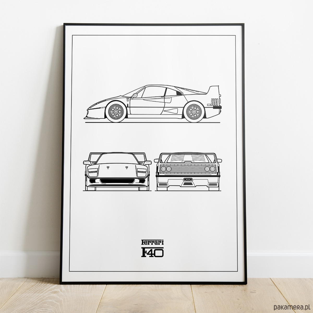 Plakat z modelem samochodu Ferrari F40. Kultowy model zaprezentowany z każdej strony, z dbałością o najmniejszy szczegół sprawi, że fan motoryzacji będzie zachwycony