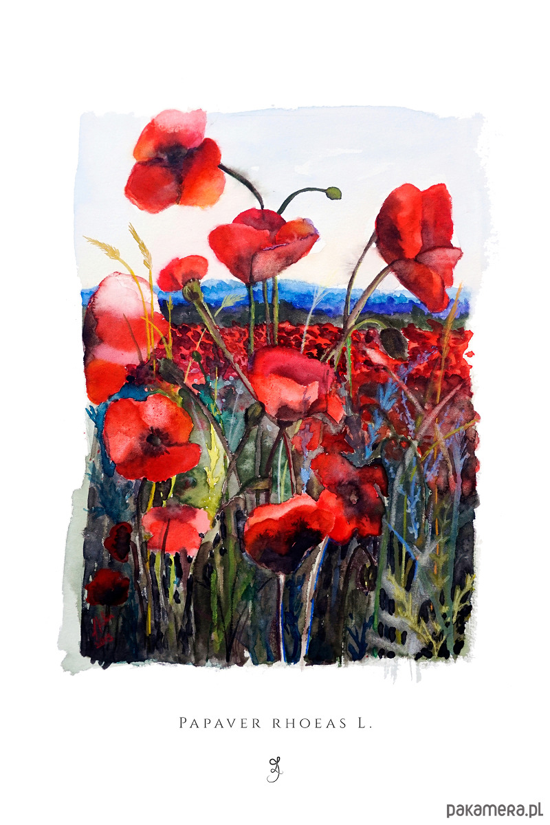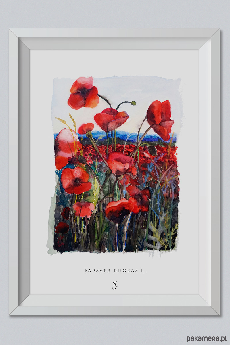 Plakat krajobraz z makami przedstawia łąkę z makami – Mak polny / łac. Papaver rhoeas L. Grafika jest oparta na autorskiej akwareli. Rośliny zostały wkomponowane w jasne tło-niebo z daleko widocznymi zarysami górskimi. Otwarta kompozycja nadaje ilustracji nieco melancholijnego wyglądu. Lekko nasycone kolory wprowadzą odrobinę dynamiki i życia do każdego pomieszczenia. Zastosowanie kolorystyki ograniczonej do czerwieni i zieleni sprawia, że plakat jest przyjemniejszy w odbiorze. Wykorzystanie bieli kartki nadaje ilustracji poczucie lekkości i delikatności. Na dole plakatu znajduje się łacińska nazwa rośliny oraz logo pracowni. Plakaty są sygnowane i numerowane.