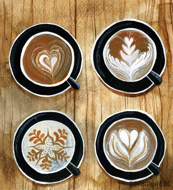 Bariści swoje wzory na kawach malują mlekiem, my zaś do tego używamy akwareli. Dziewięć filiżanek z kawą, a każda zwieńczona innym wzorkiem. Plakat w uniwersalnym kolorze – sprawdzi się w każdym wnętrzu.