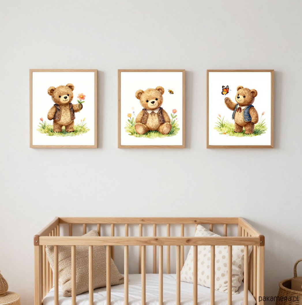Dekoracja ścienna. Obrazki akwarelowe z uroczym misiem.