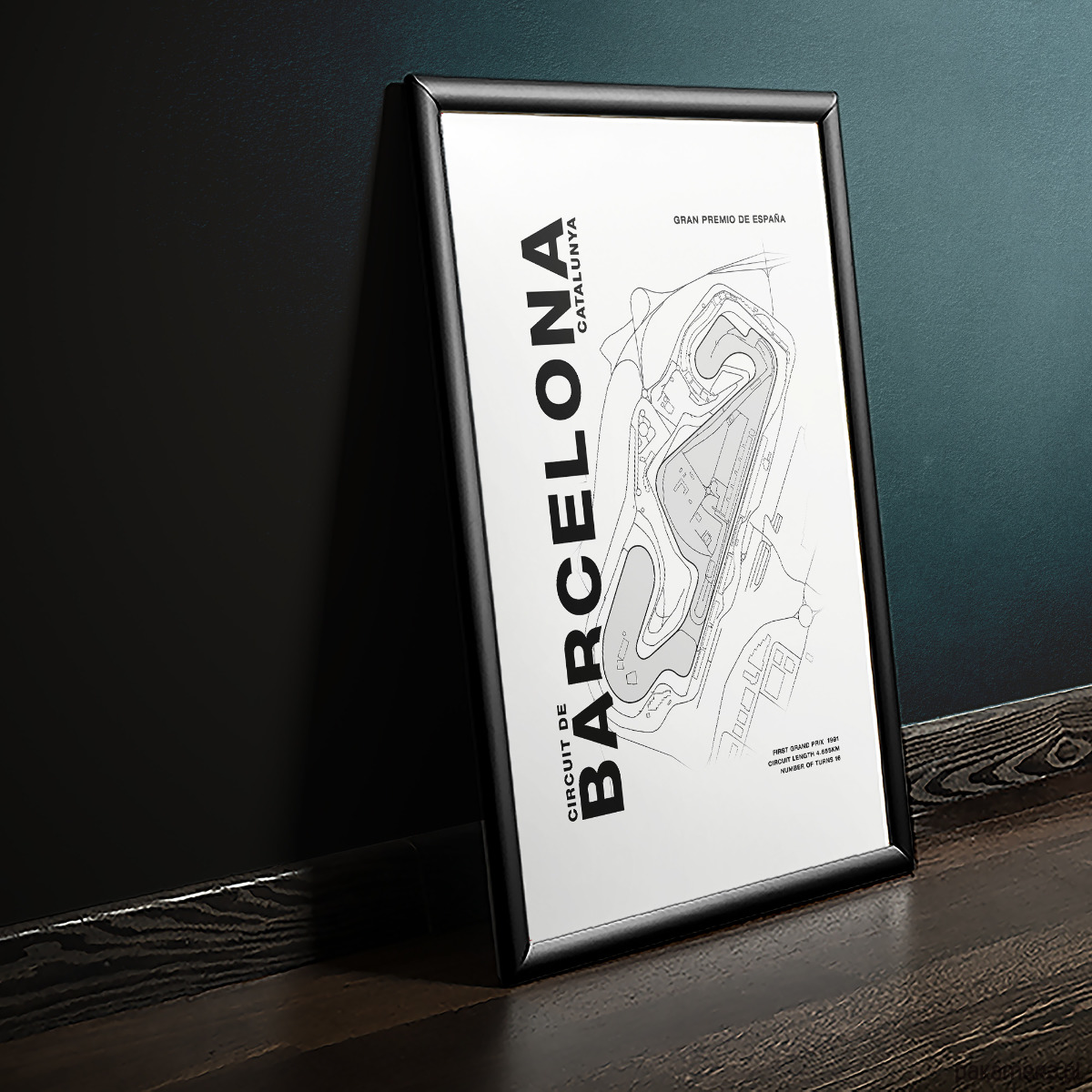 Grafika przedstawia obrys toru Circuit de Barcelona Catalunya wraz z okolicznymi drogami oraz budynkami.