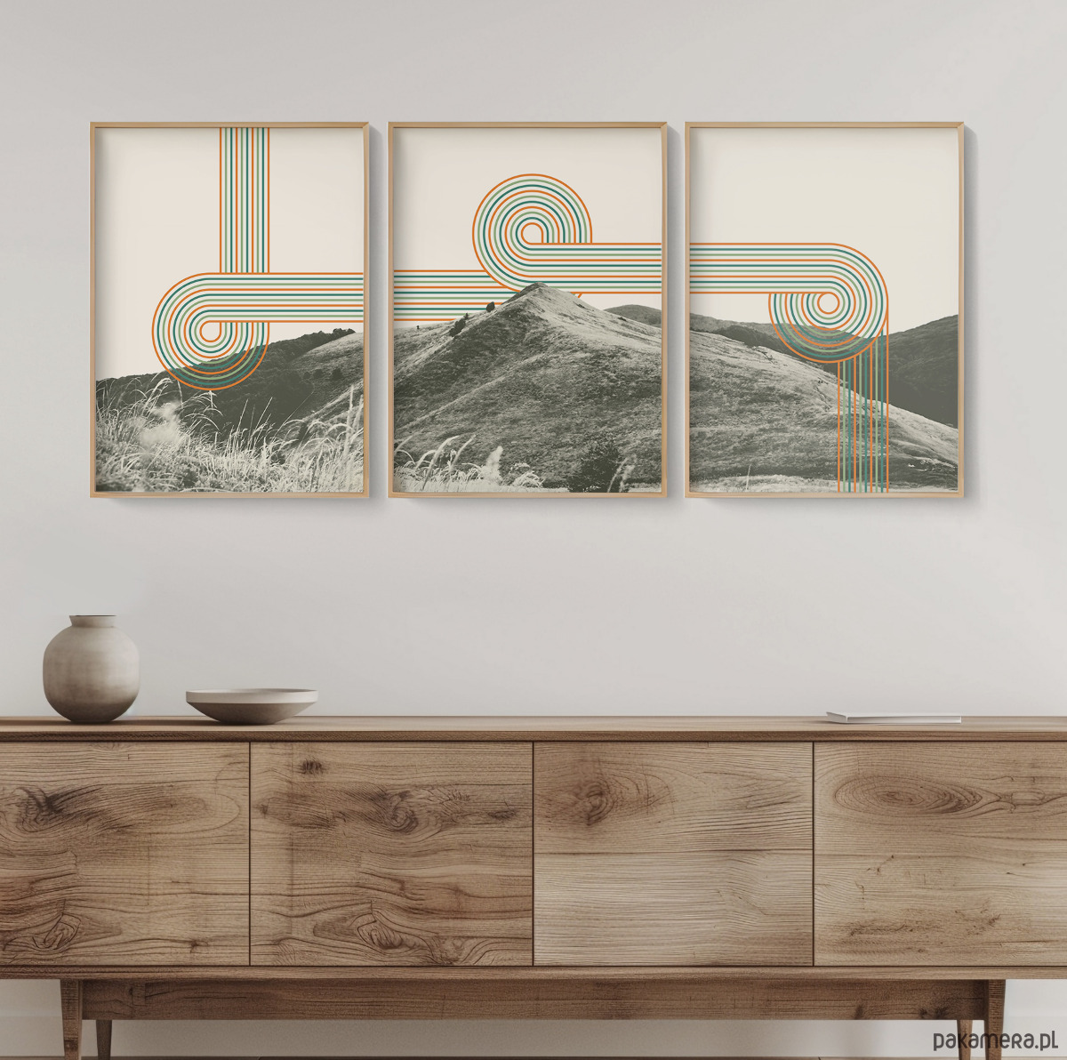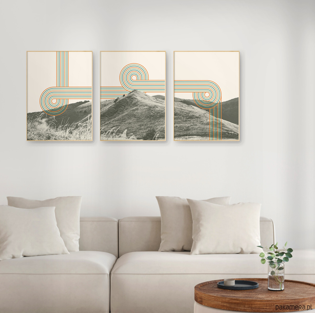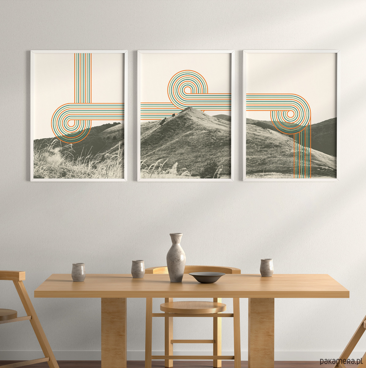 Zestaw trzech plakatów w formie tryptyku z wizerunkiem Bieszczad z elementami grafiki retro. Taka dekoracja może stanowić świetną ozdobę ścian w salonie, sypialni, przedpokoju czy też kuchni, dodając wnętrzu oryginalności i naturalnego klimatu.
