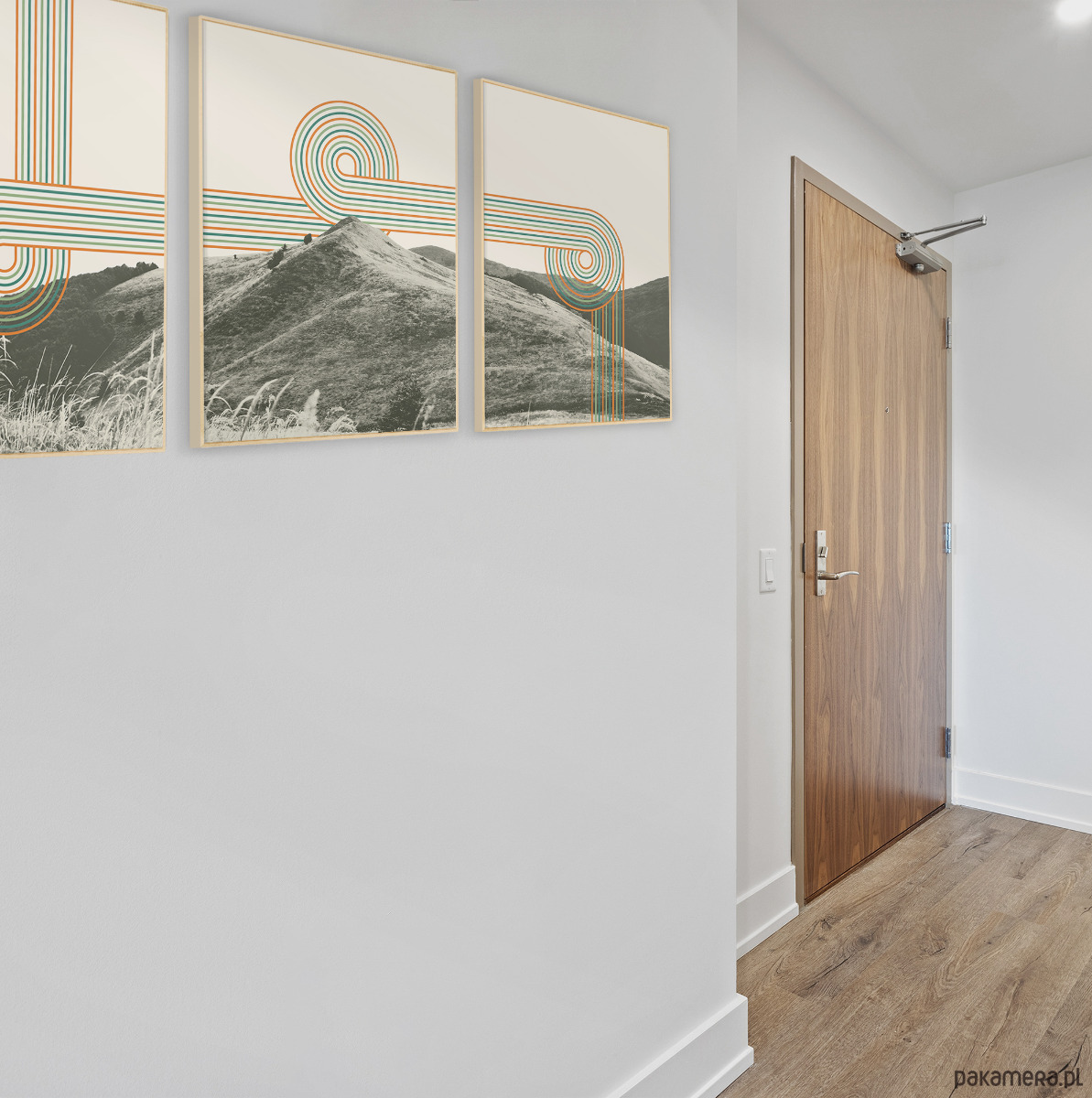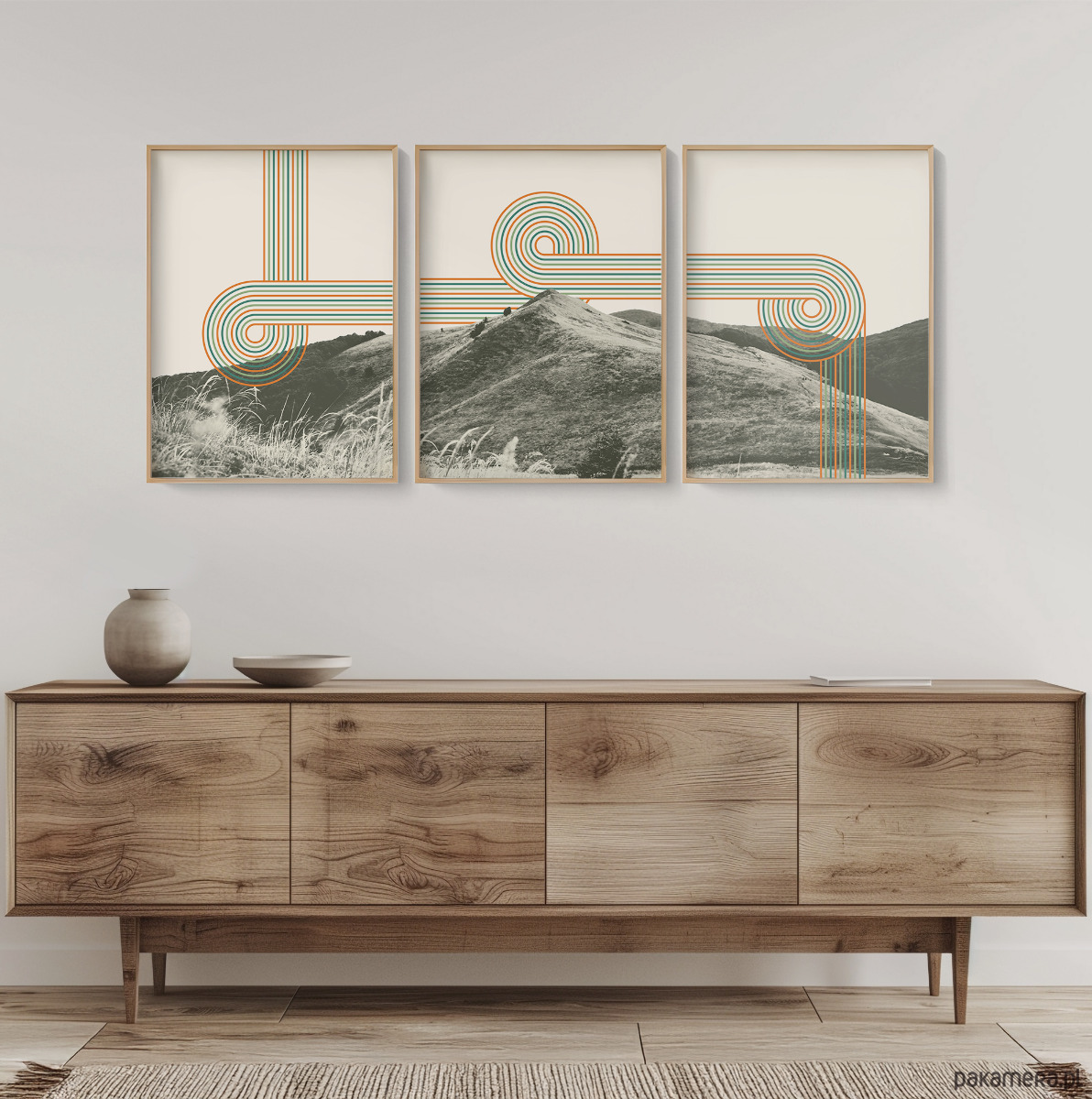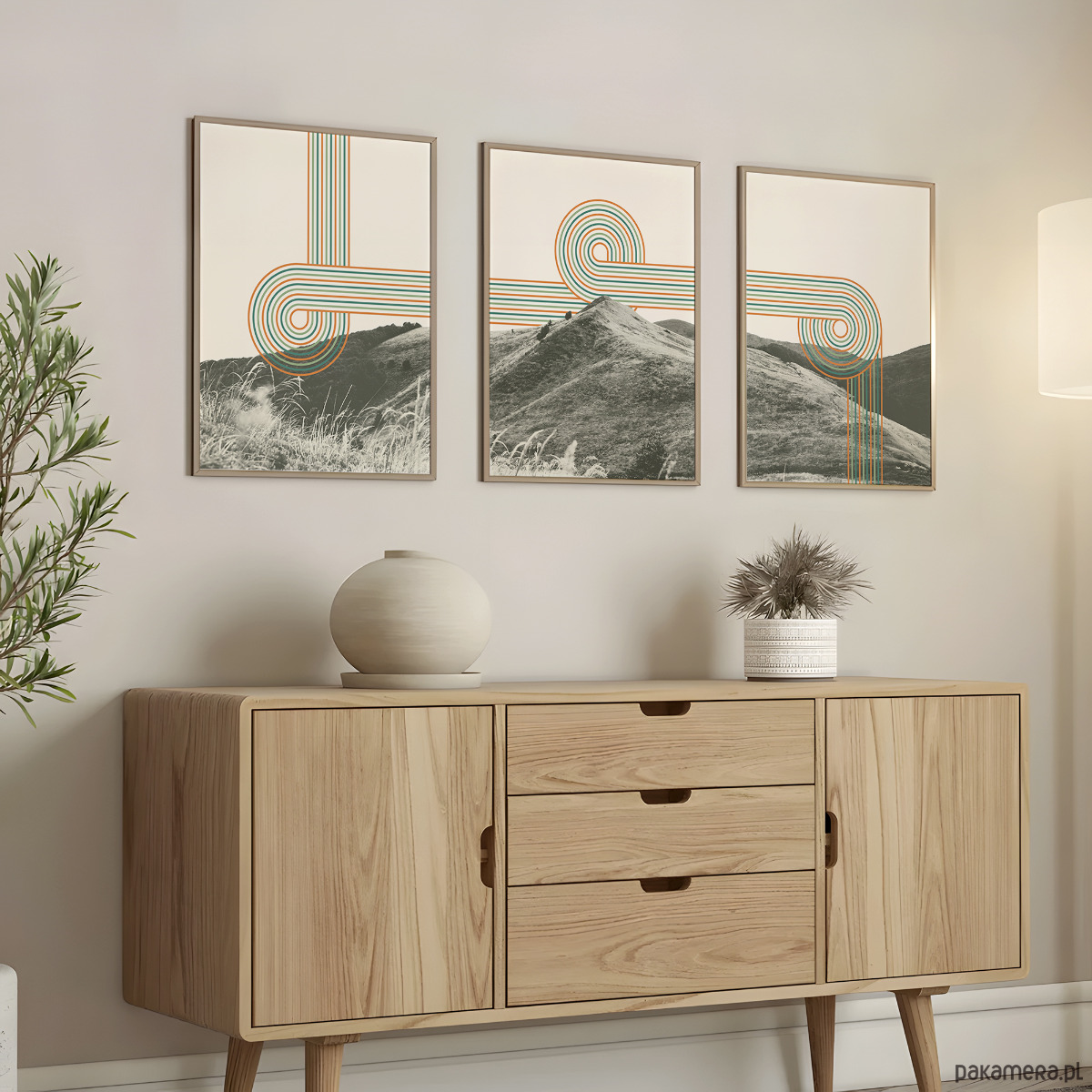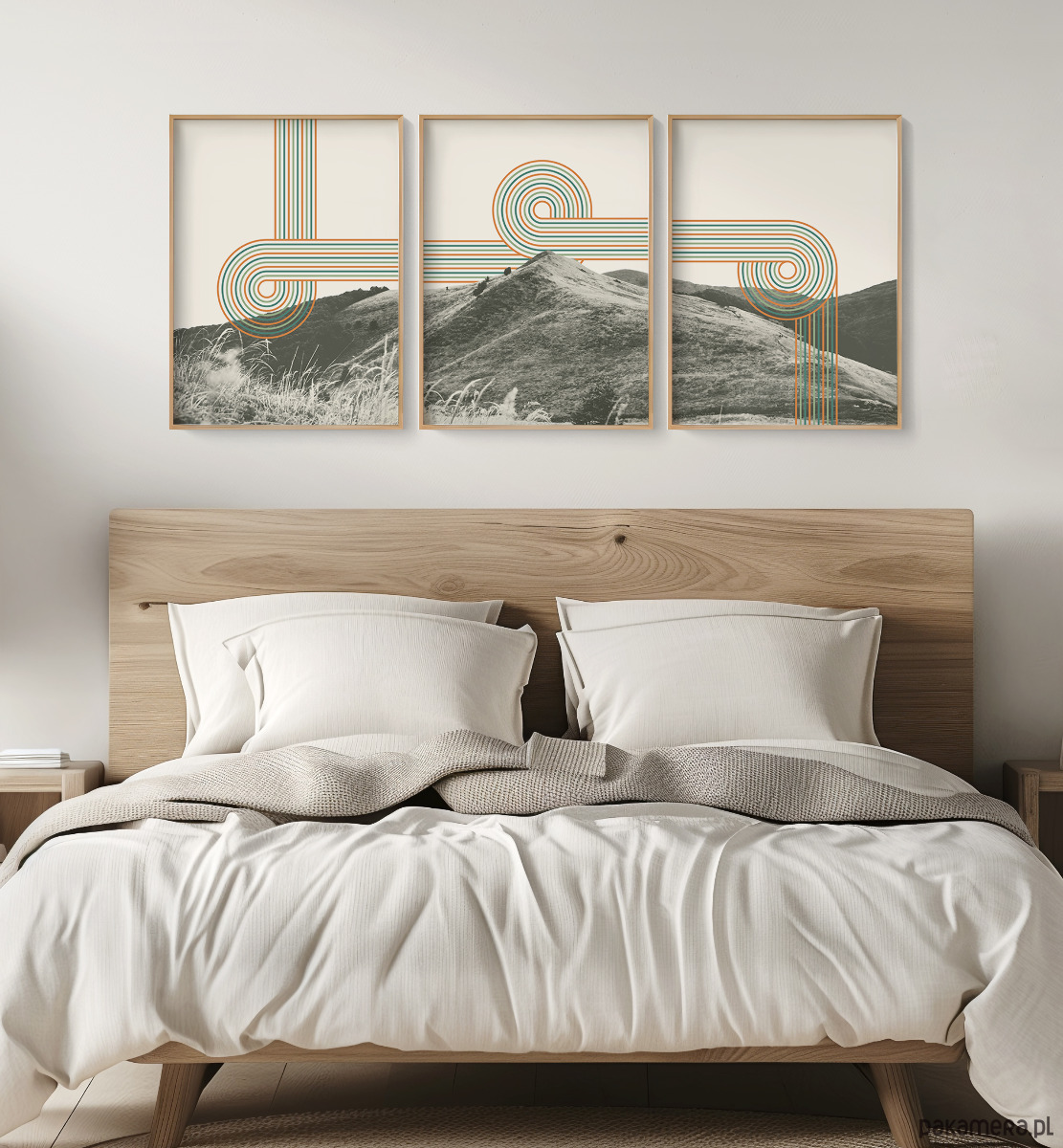 Zestaw trzech plakatów w formie tryptyku z wizerunkiem Bieszczad z elementami grafiki retro. Taka dekoracja może stanowić świetną ozdobę ścian w salonie, sypialni, przedpokoju czy też kuchni, dodając wnętrzu oryginalności i naturalnego klimatu.
