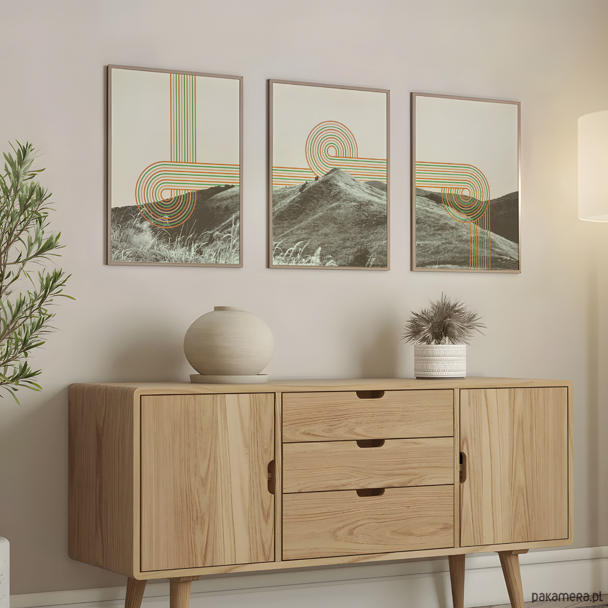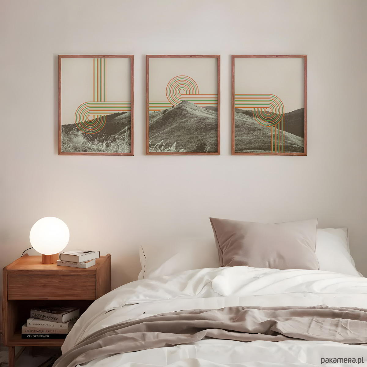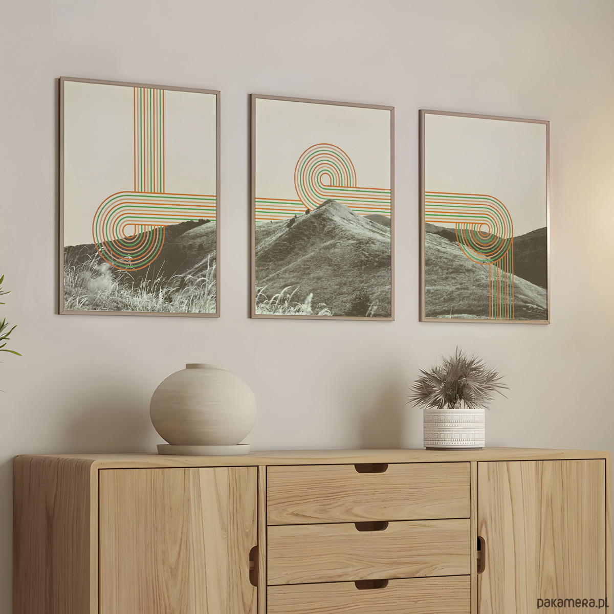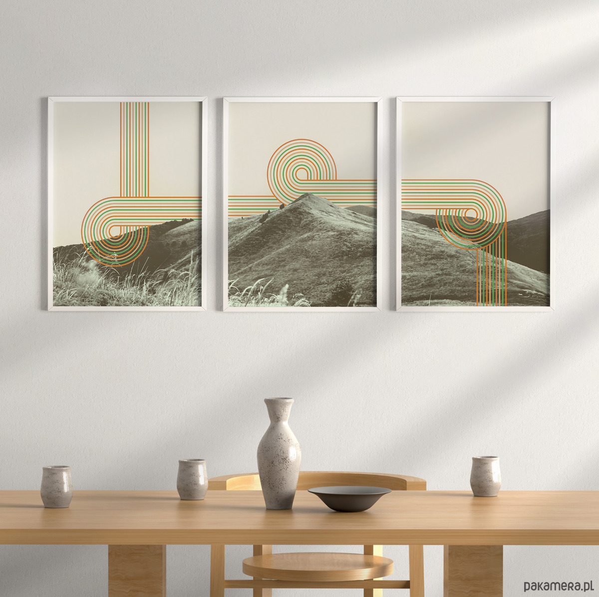 Abstrakcyjny zestaw trzech plakatów z elementami retro w formie tryptyku z wizerunkiem Bieszczad. Ta oryginalna grafika w stylu mid-century, może świetnie odnaleźć się w nowoczesnych, minimalistycznych czy też skandynawskich wnętrzach.