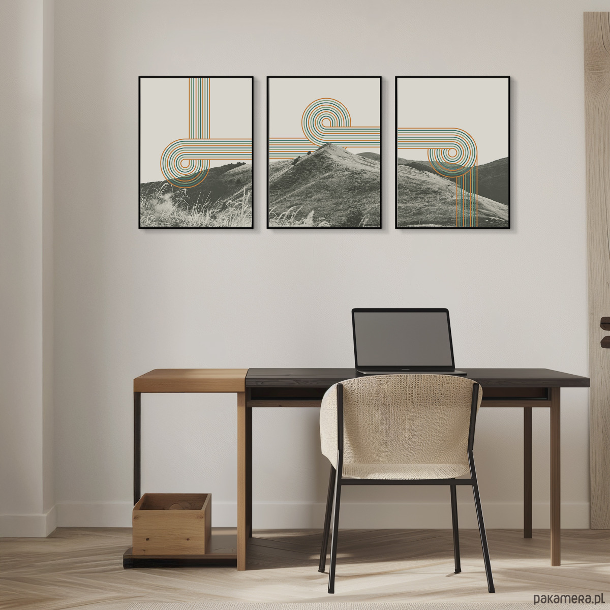 Plakaty zestaw/tryptyk góry Bieszczady, nowoczesne, w stylu retro, mid-century.