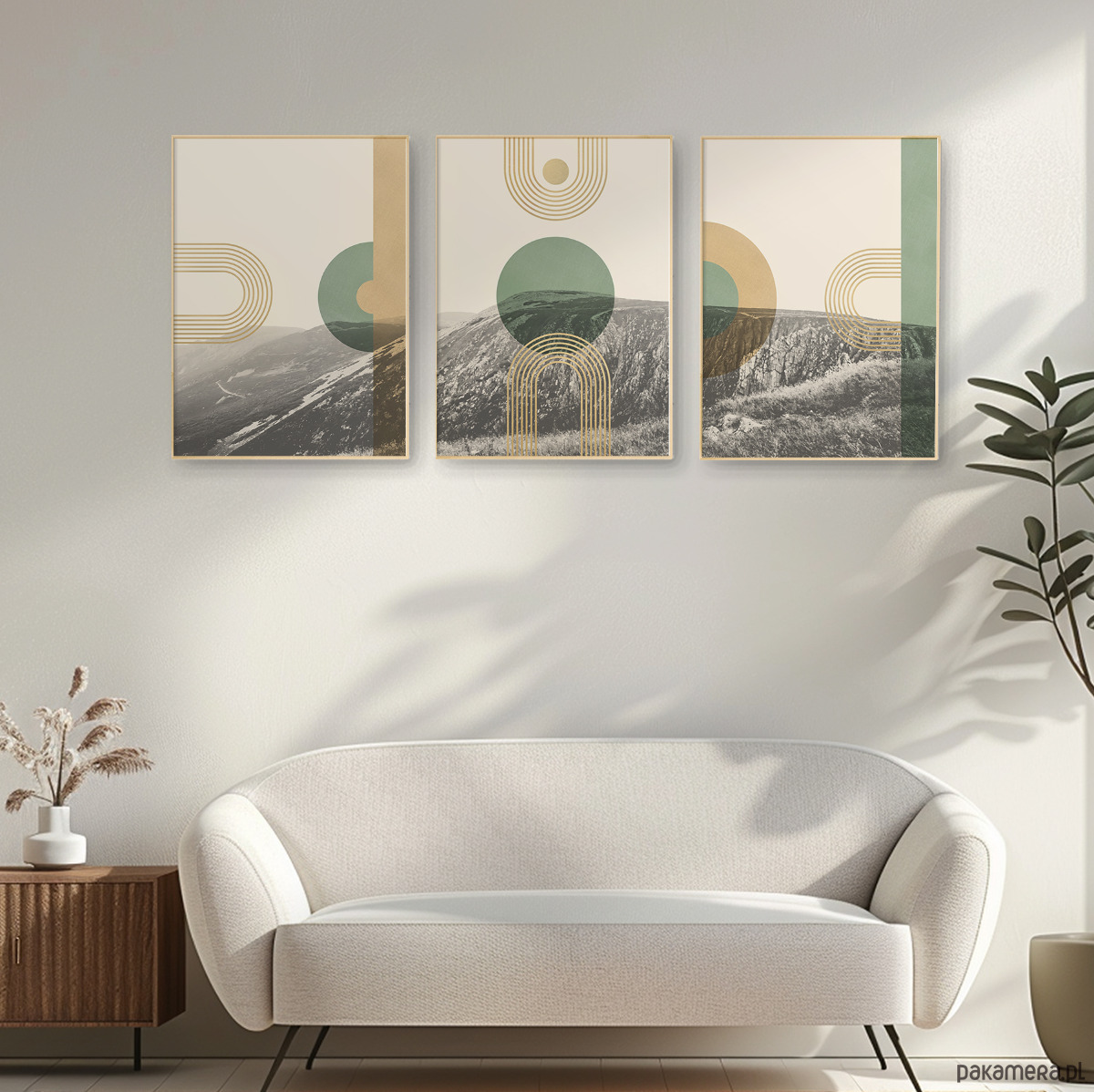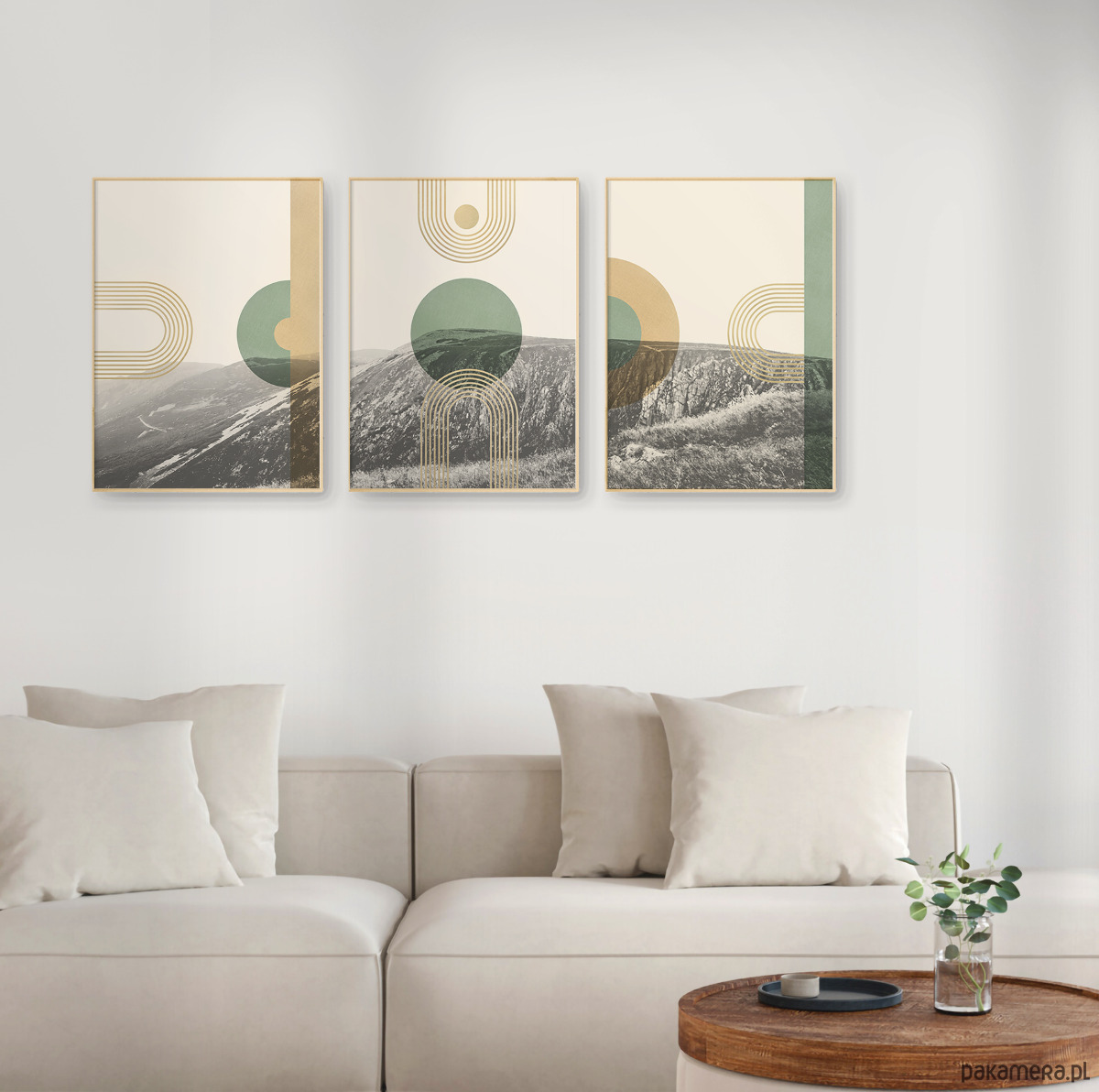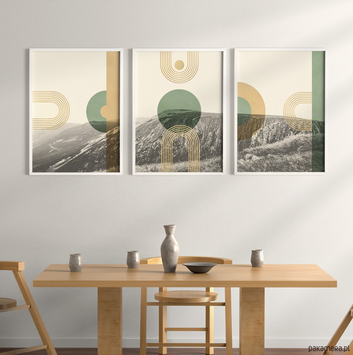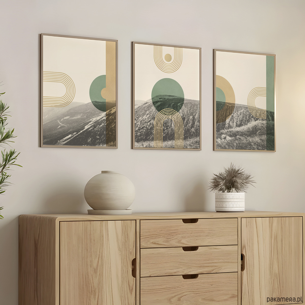 Abstrakcyjny zestaw 3 plakatów w formie tryptyku z wizerunkiem Karkonoszy w nowoczesnym wydaniu mid-century. Połączenie realistycznej fotografii gór z geometrycznymi elementami nadaje kompozycji elegancki, designerski charakter.