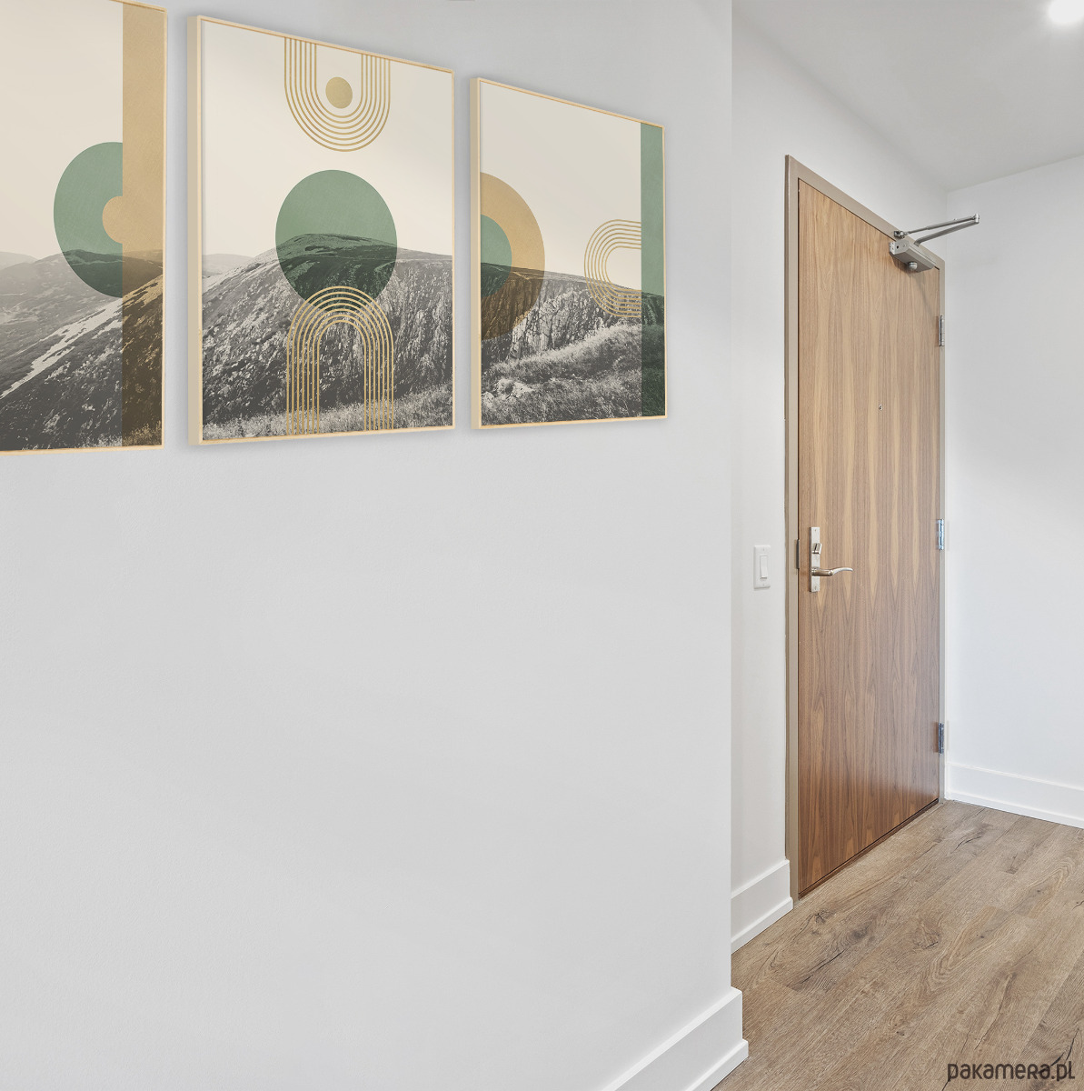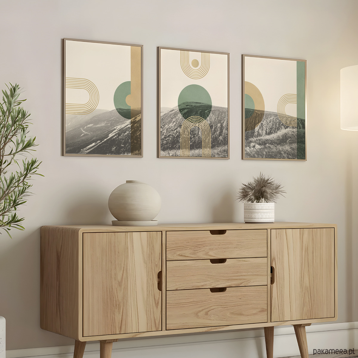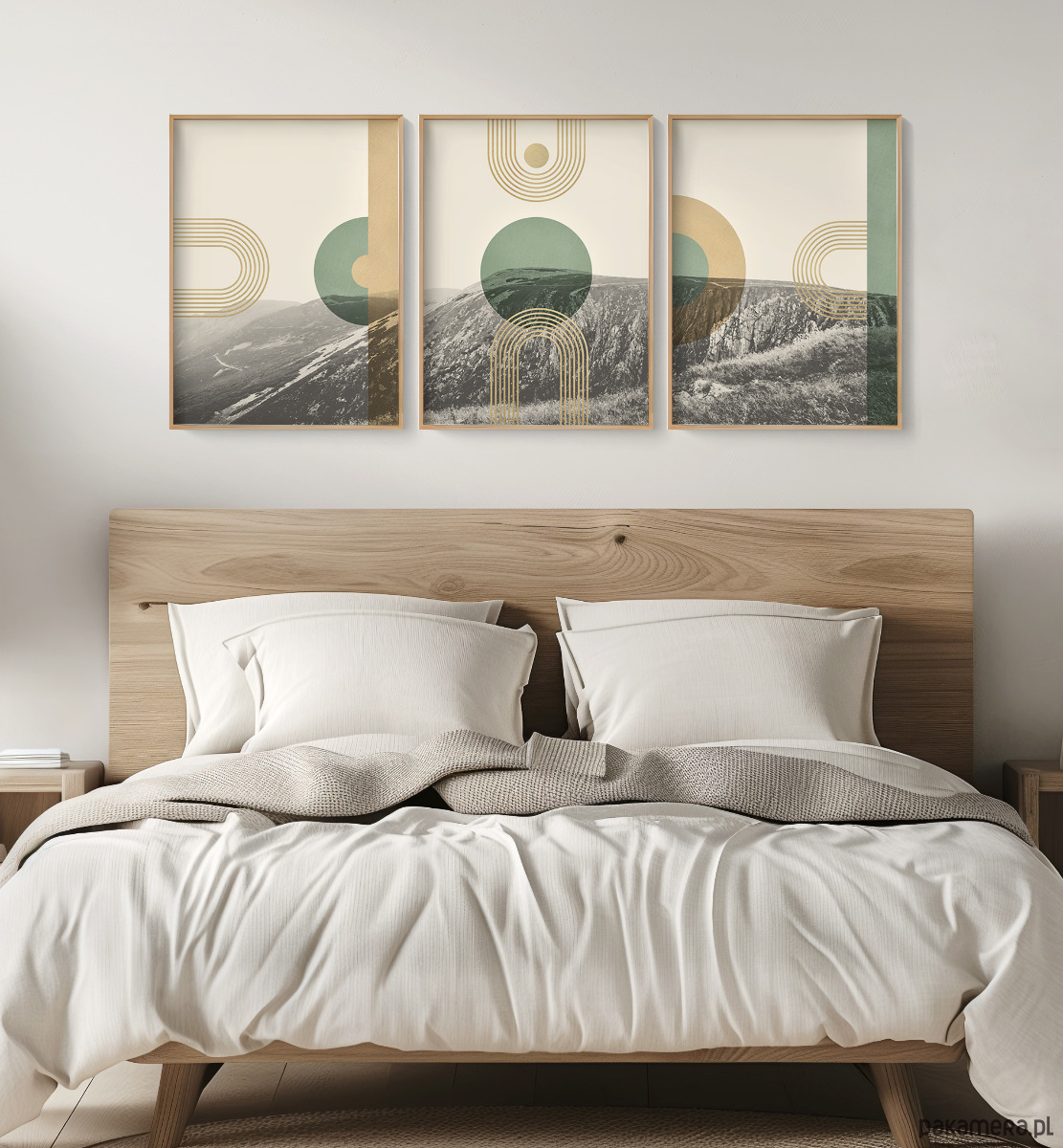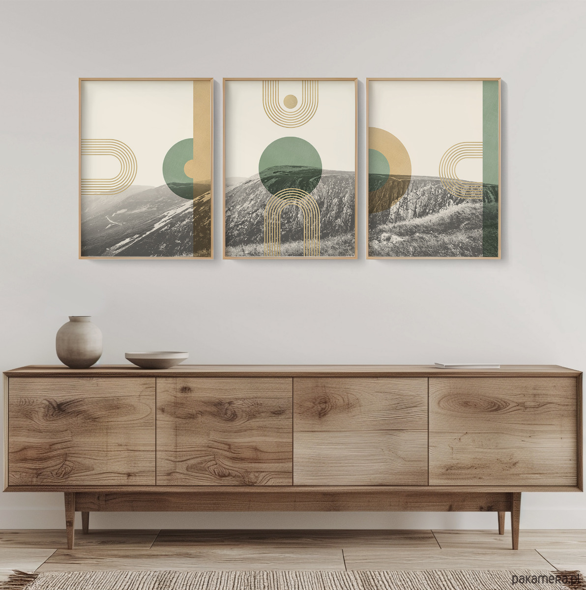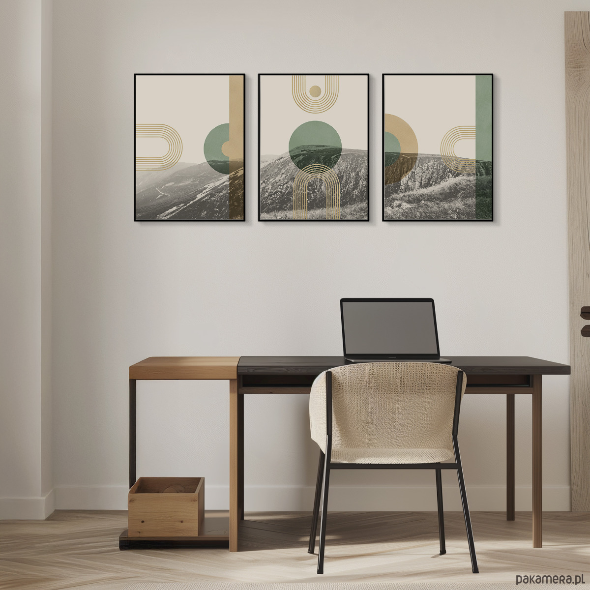 Abstrakcyjny zestaw 3 plakatów w formie tryptyku z wizerunkiem Karkonoszy w nowoczesnym wydaniu mid-century. Połączenie realistycznej fotografii gór z geometrycznymi elementami nadaje kompozycji elegancki, designerski charakter.