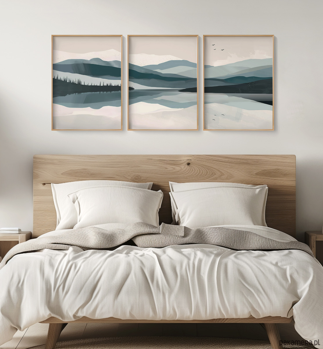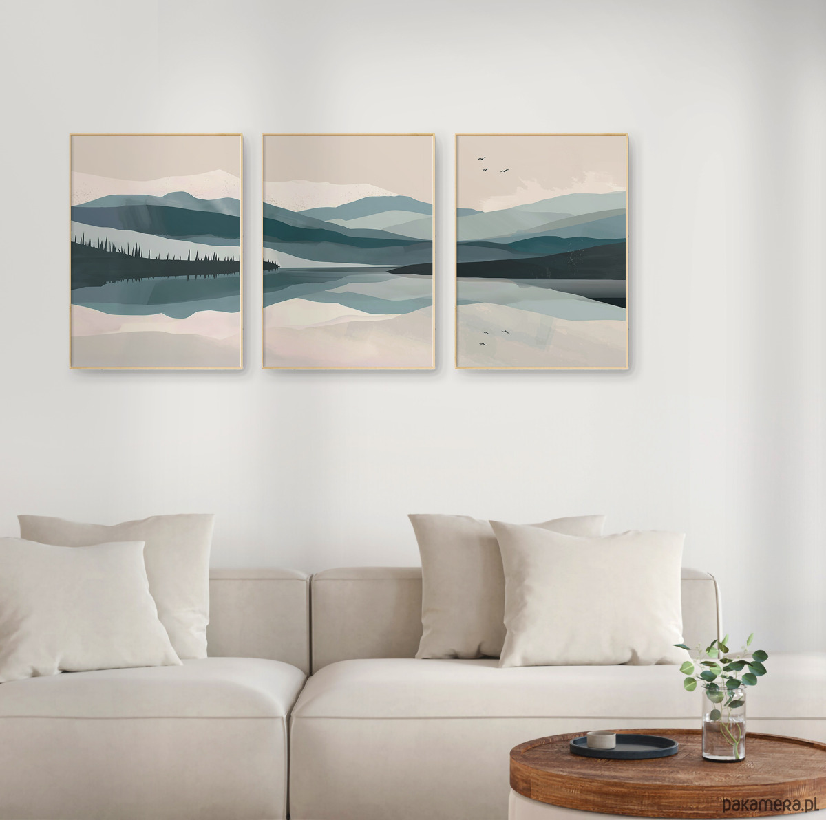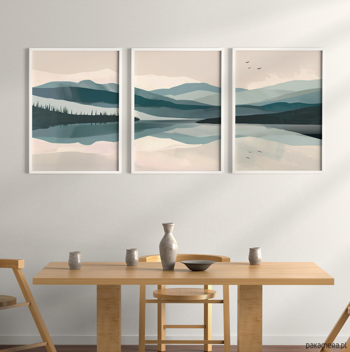 Plakaty zestaw/tryptyk natura, góry, jeziora, stylowe, minimalistyczne.